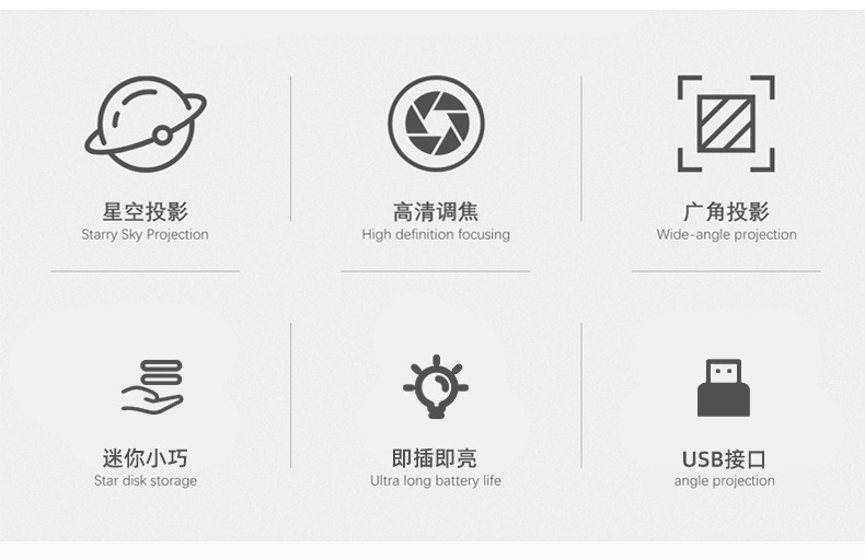 产品特色:采用独特的子弹头流线型设计,高清调焦、星空投影、玻璃镜片、即插即亮;封密光基不进灰尘,不褪色,不变形,使用寿命长, 有多个场景可选。