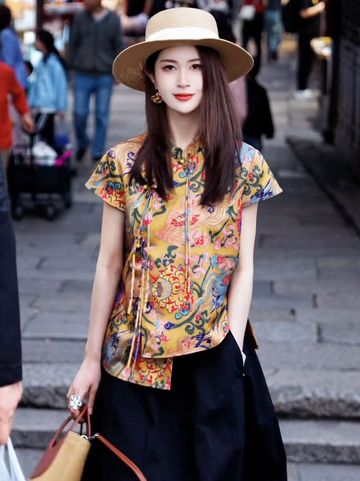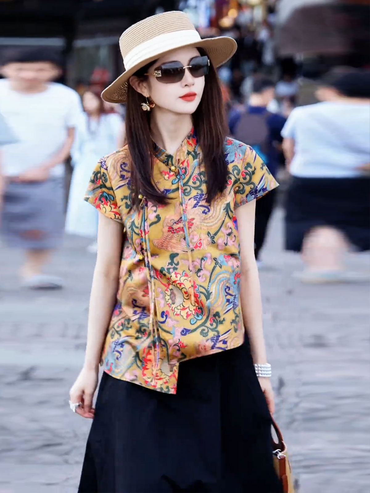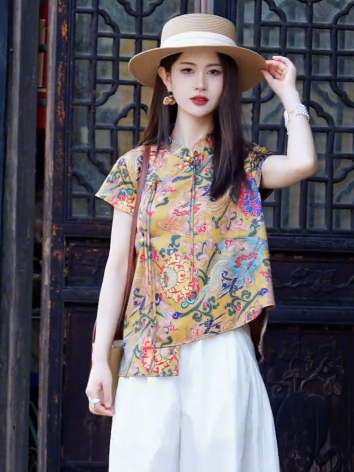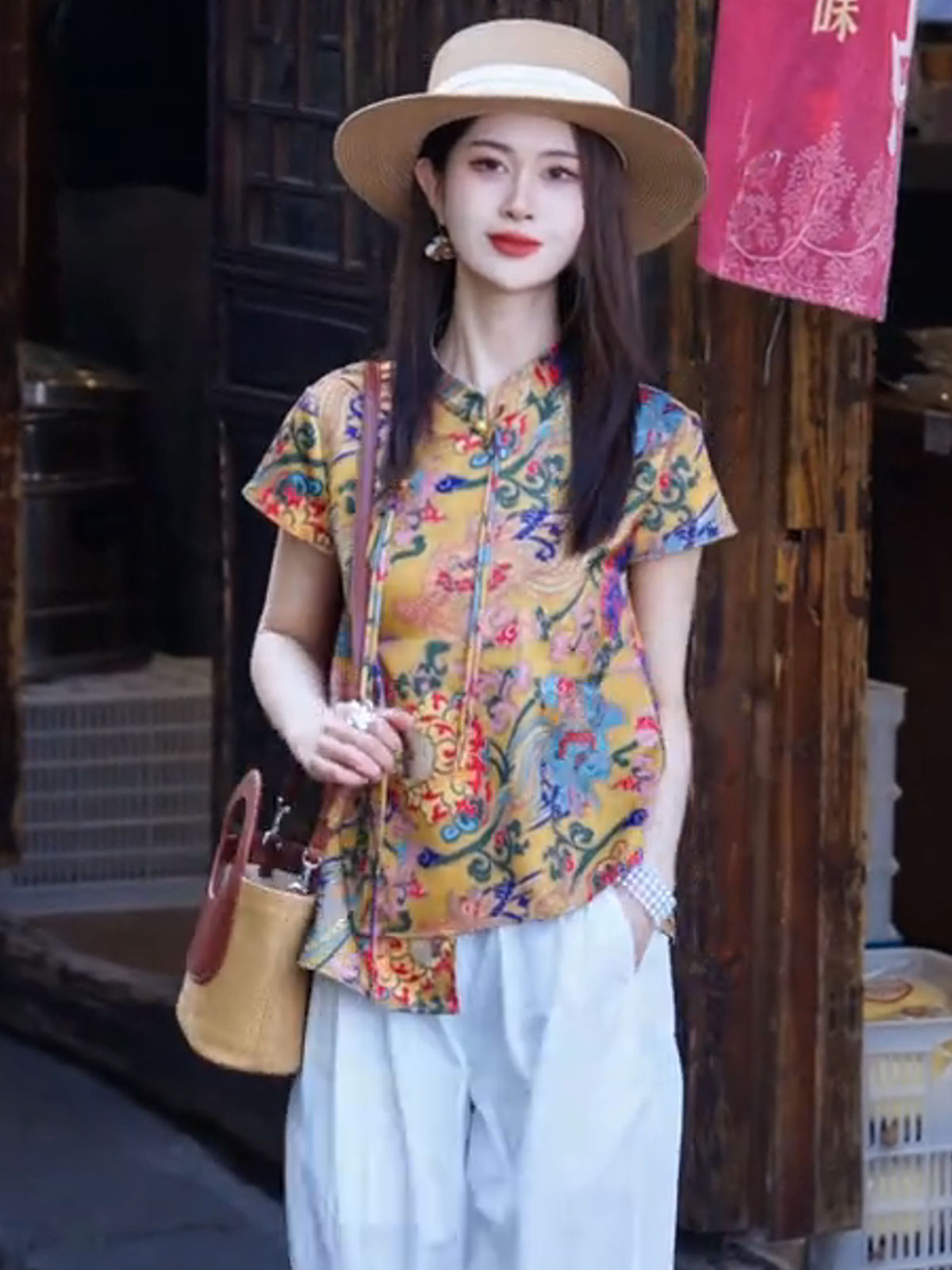 새로운 중국 스타일 여성 의류 2025 새로운 스타일의 작은 셔츠 디자인 틈새 반팔 프린트 셔츠 버튼 업 칼라 탑