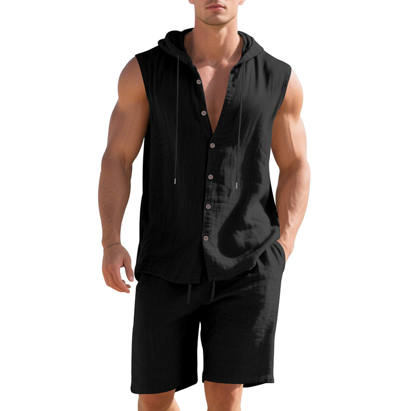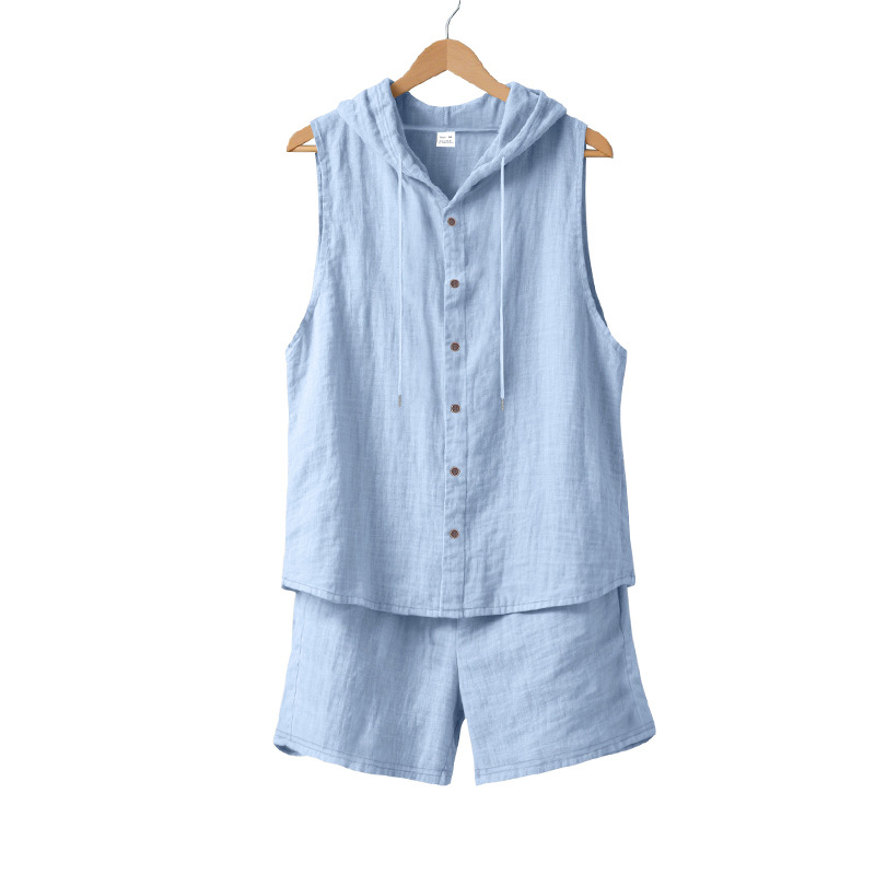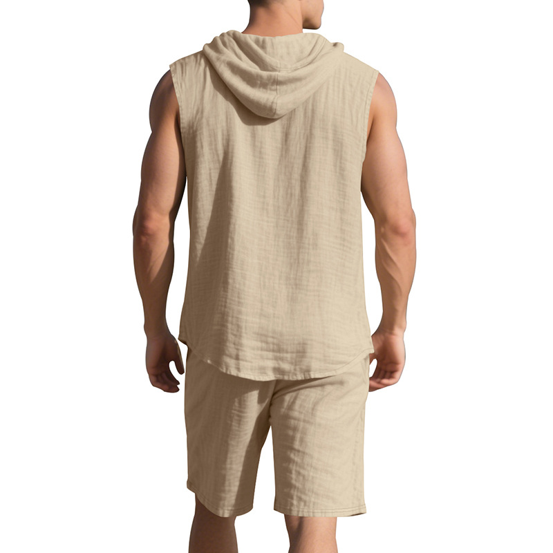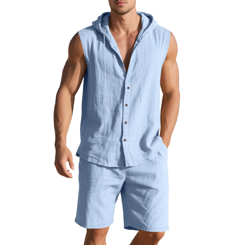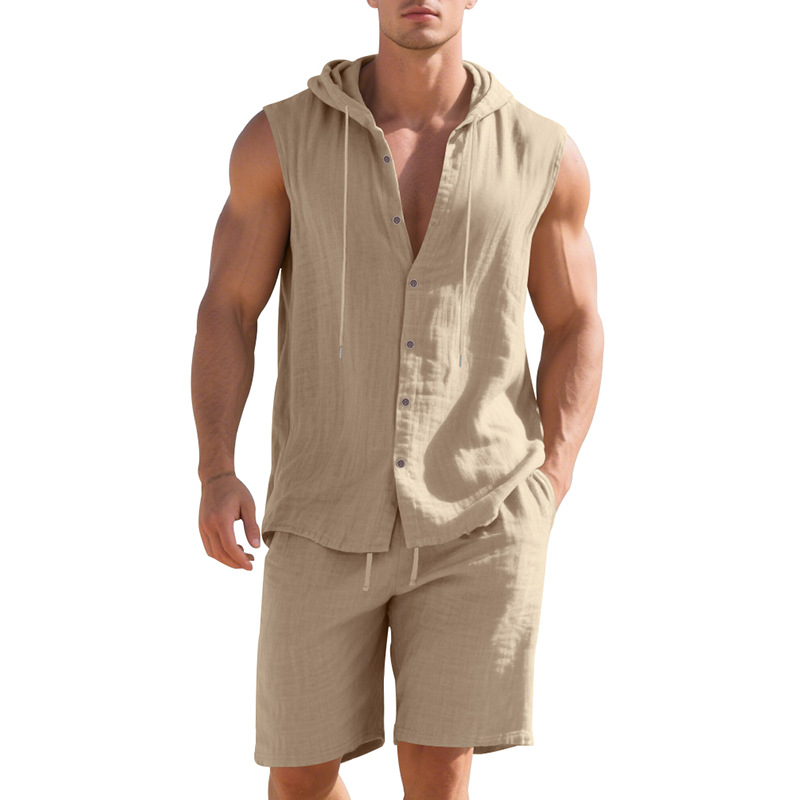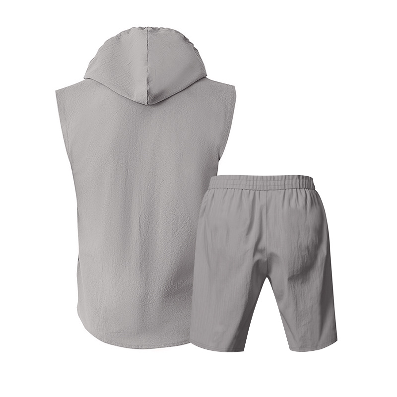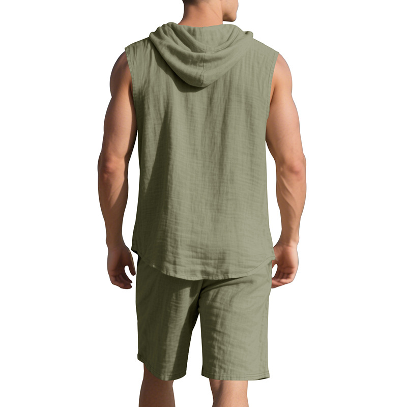 25 크로스보더 아마존 여름 린넨 슈트 남성 캐주얼 민소매 조끼 후드 린넨 셔츠 반바지 슈트