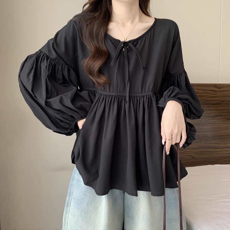 초가을 여성용 고급 블랙 긴팔 쉬폰 셔츠, 플러스 사이즈, 뚱뚱한 배 커버, 루즈한 연령 감소 인형 셔츠 탑스토어 가기