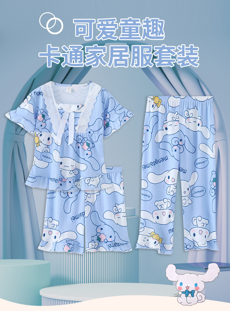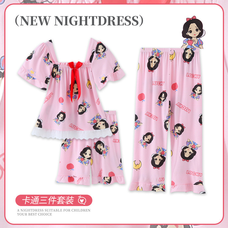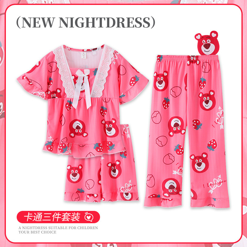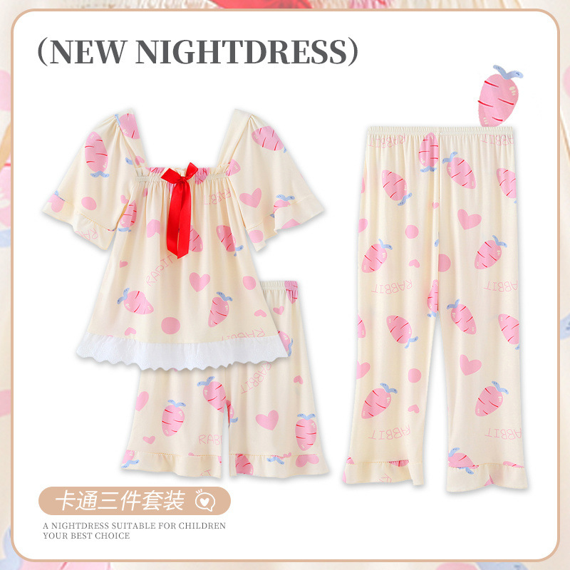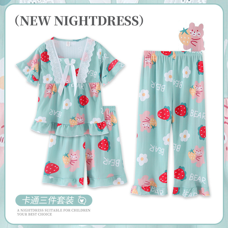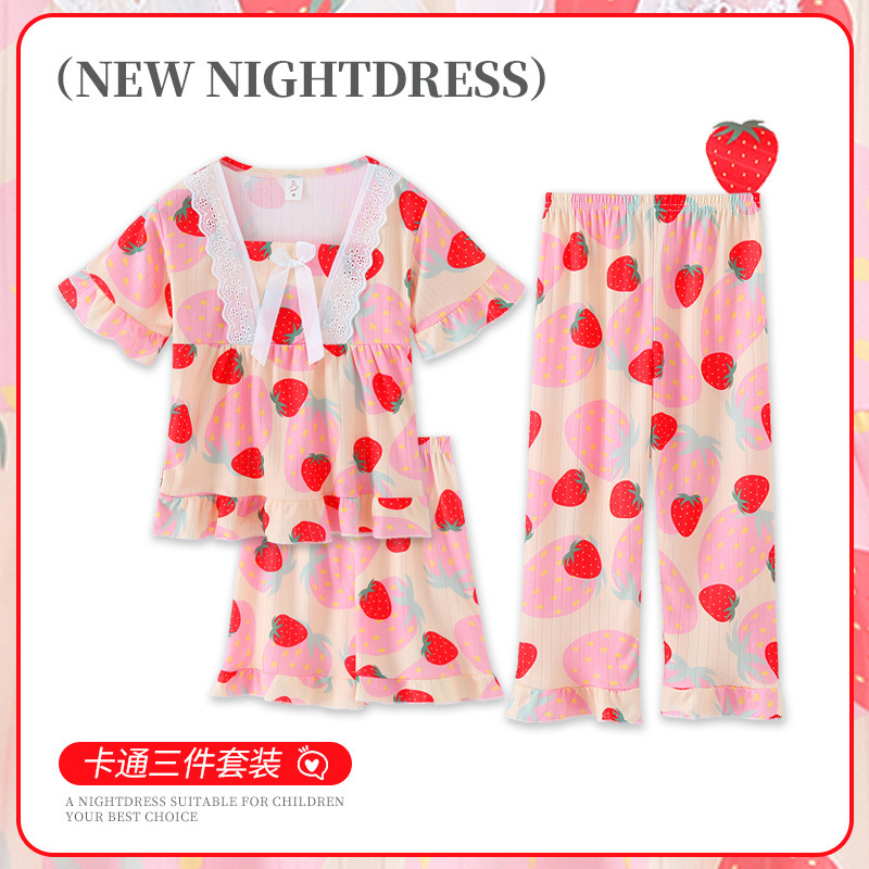 여름 어린이 잠옷, 여아용 반팔 바지 3피스 슈트, 여아용 여름 얇은 중대형 아동복스토어 가기
