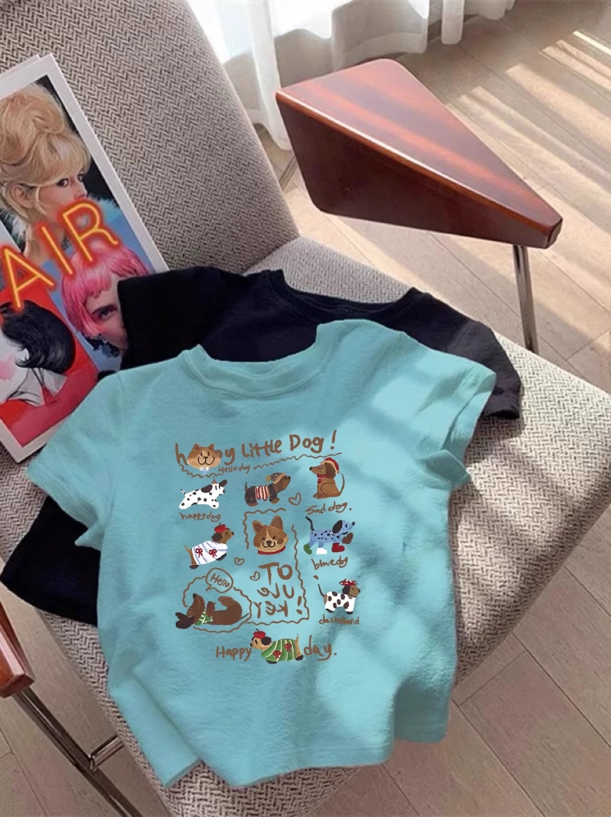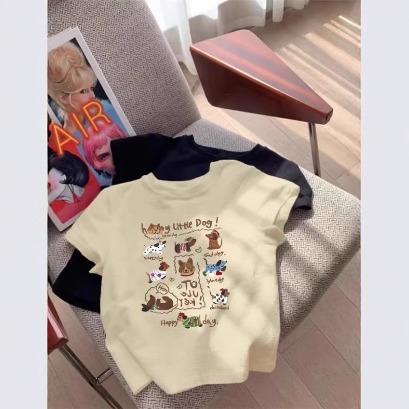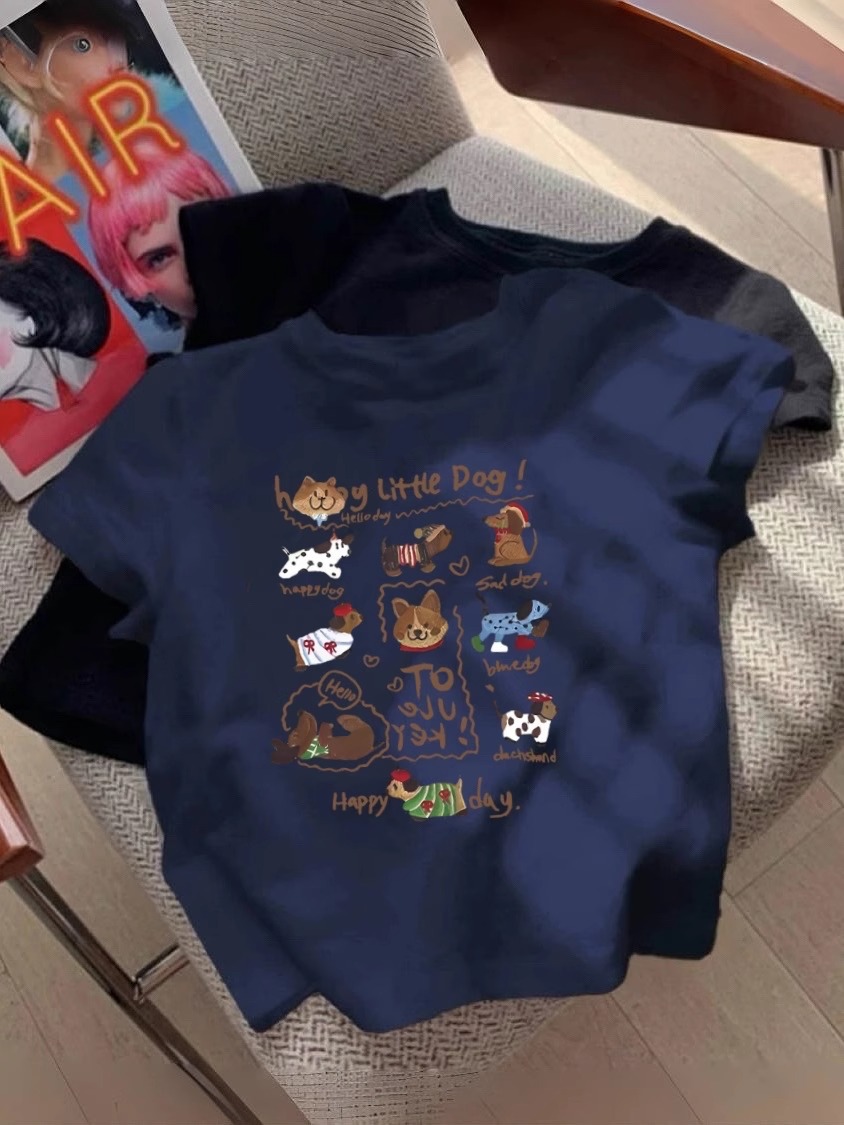 여성용 네이비 블루 퓨어 코튼 반팔 티셔츠 2025 인터넷 연예인 핫 스타일 아메리칸 프린트 탑 오른쪽 어깨 라운드 넥 핫 소녀 셔츠