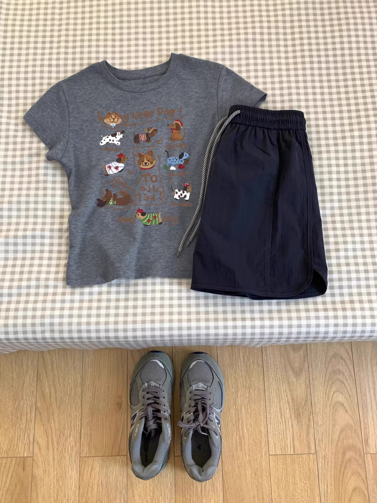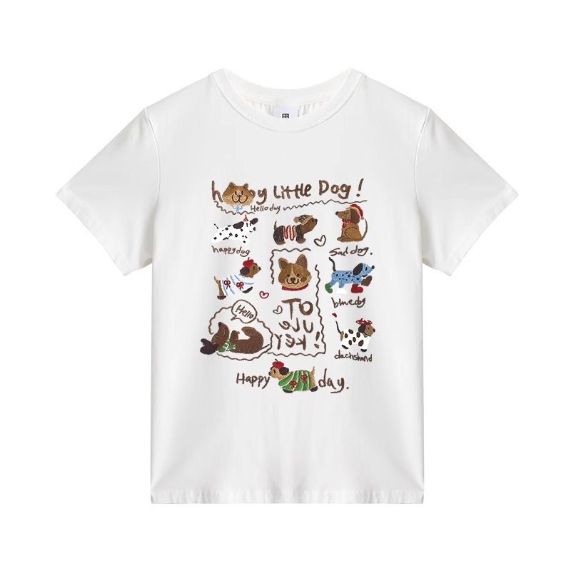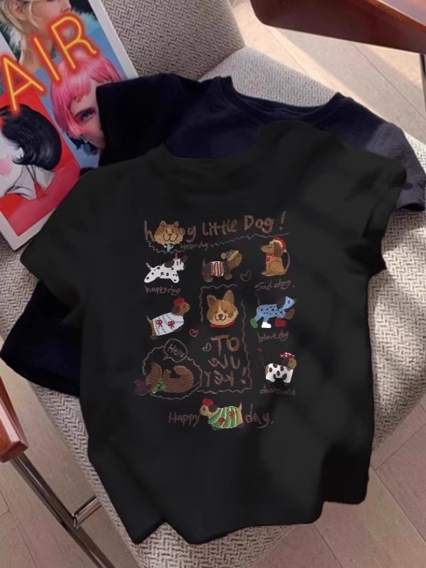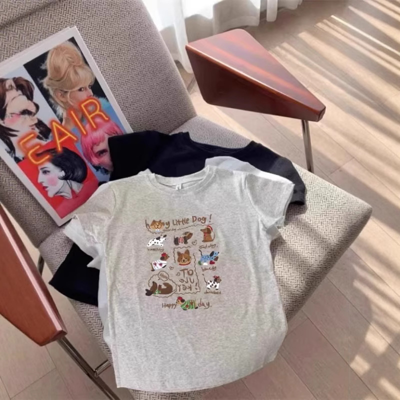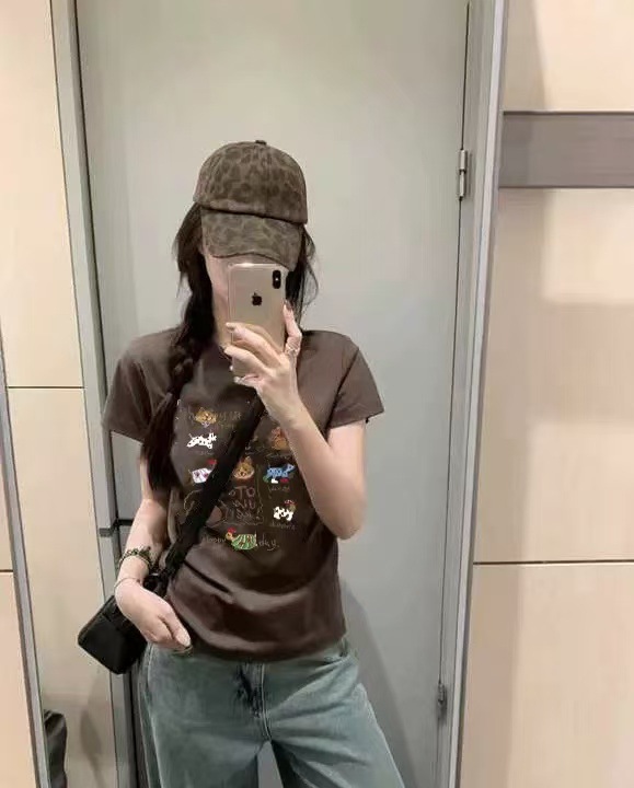 여성용 네이비 블루 퓨어 코튼 반팔 티셔츠 2025 인터넷 연예인 핫 스타일 아메리칸 프린트 탑 오른쪽 어깨 라운드 넥 핫 소녀 셔츠스토어 가기