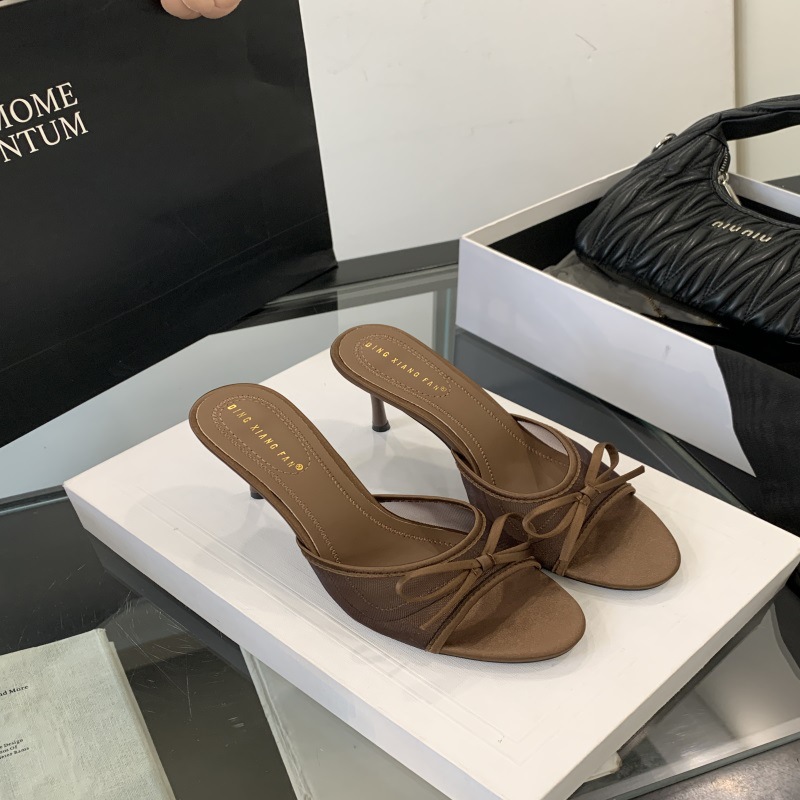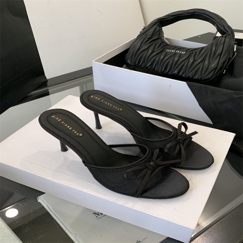 2025년 신상 여름 신발, 리본 하이힐, 메쉬 원단, 하프 드래그 오픈 토, 스틸레토 하이힐 샌들스토어 가기