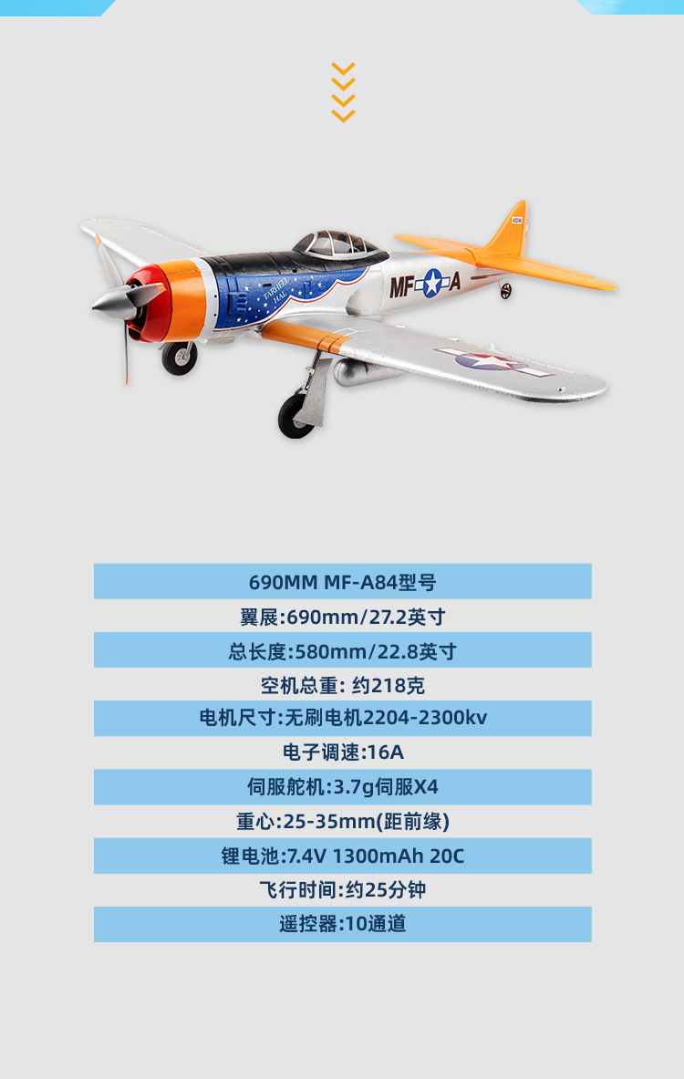 【产品明细】:彩盒*1,飞机*1,遥控器*1,充电器*1,锂电池*1,螺旋桨*1,起落架*1套,尾轮*1,螺丝刀*1,说明书*1。