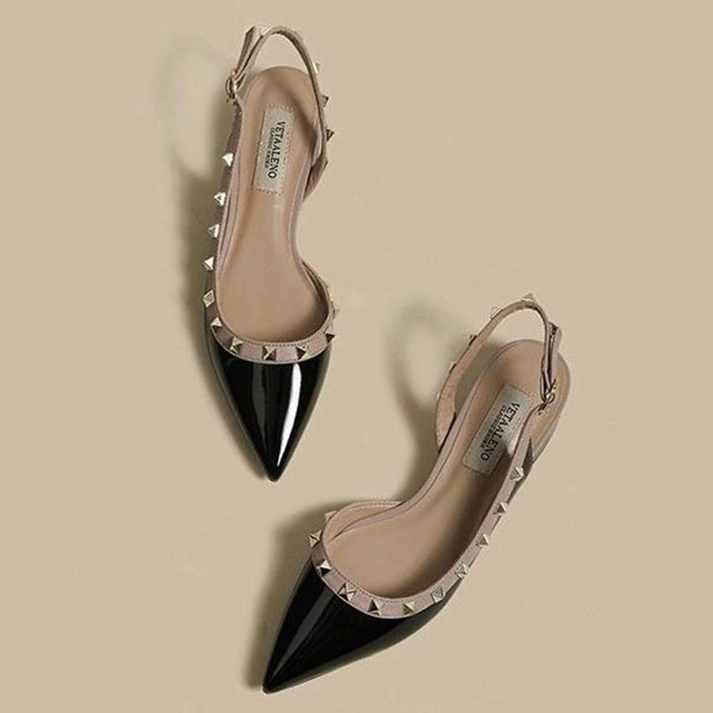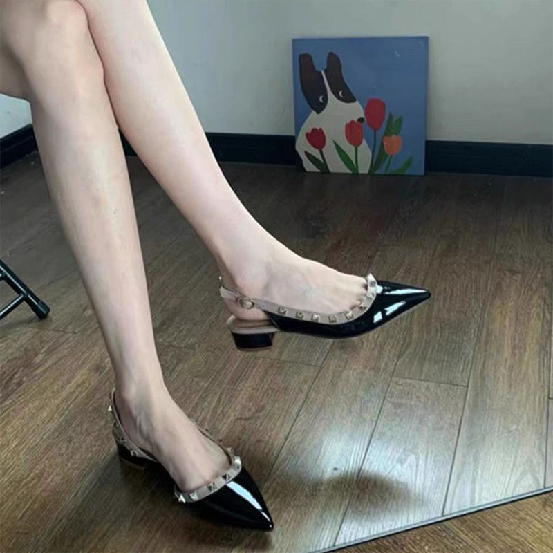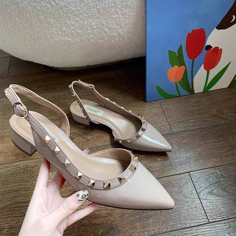 여성용 로우힐 리벳 슈즈, 두꺼운 굽, 포인티드 토, 누드 컬러 버진 플랫 슈즈, 2025 봄 가을 신상 페이턴트 가죽 토 샌들스토어 가기