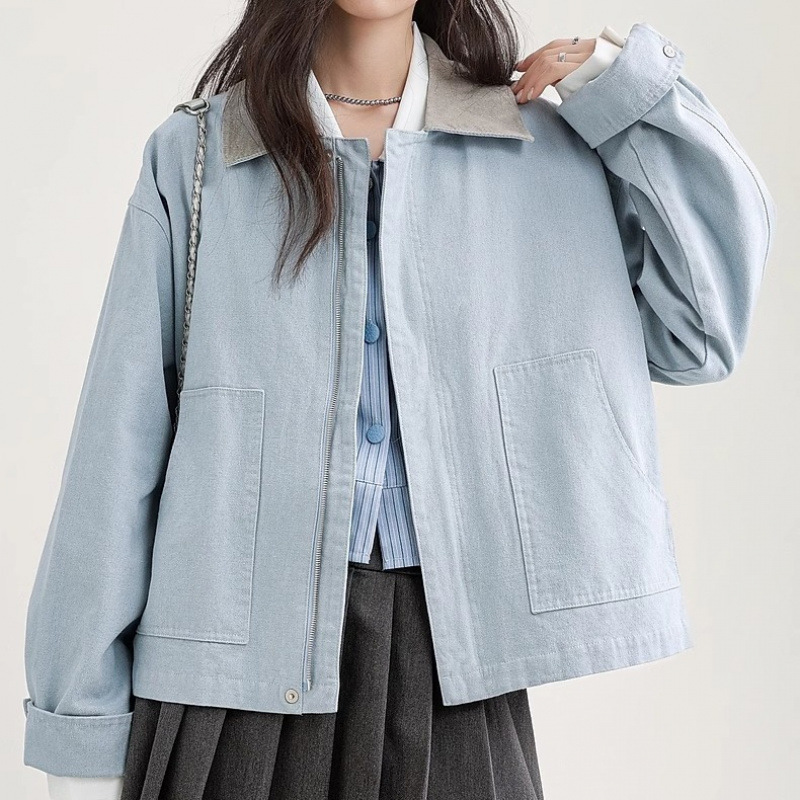 2025 봄 신상 블루 라펠 워크 재킷 여성 심플 콘트라스트 컬러 재킷 짧은 대형 포켓 다용도 탑