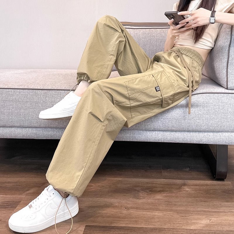 여름용 여성용 아이스 실크 속건성 작업복 얇은 하이 웨이스트 드로스트링 레깅스 하이킹 바지 캐주얼 아메리칸 하렘 스웨트 팬츠