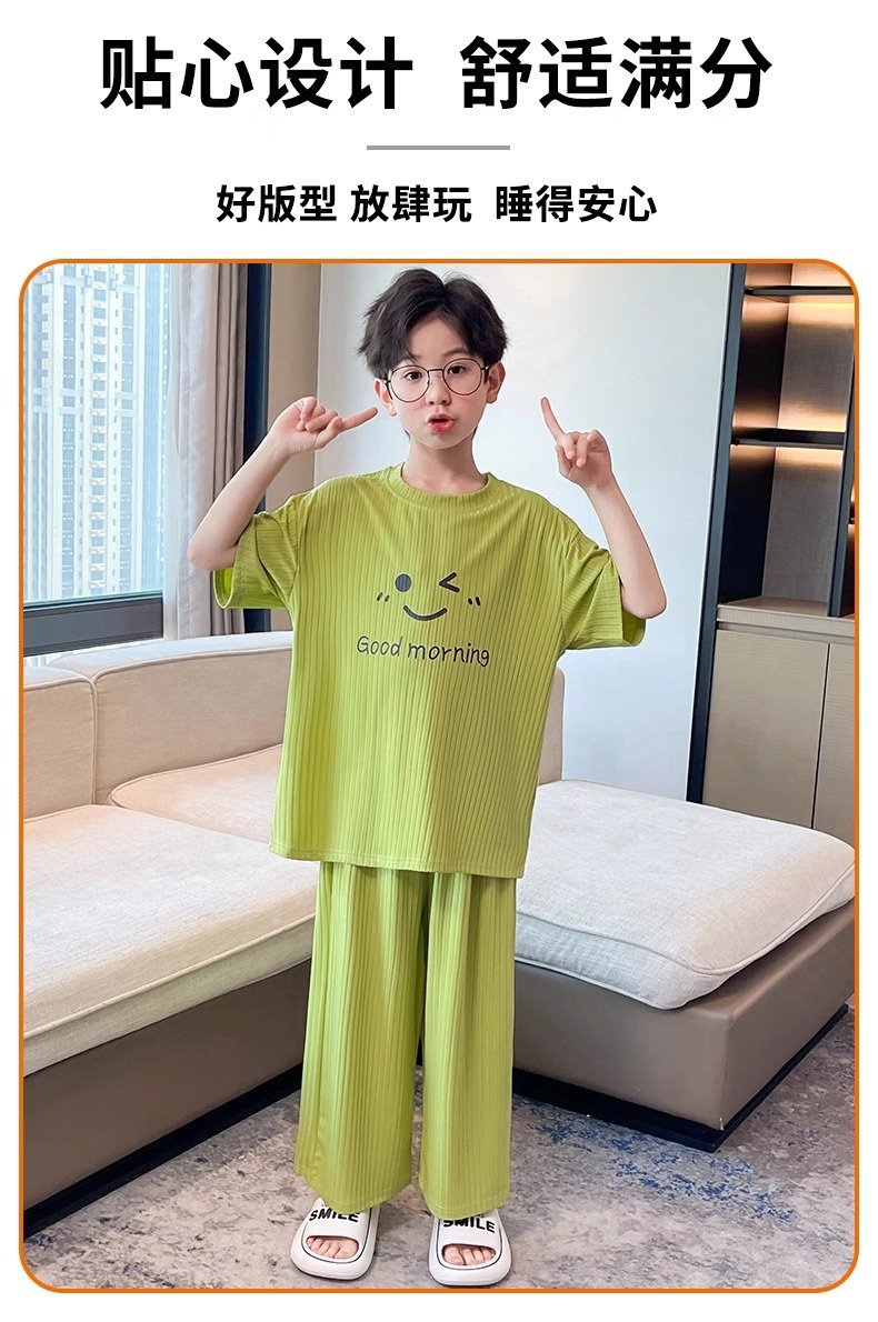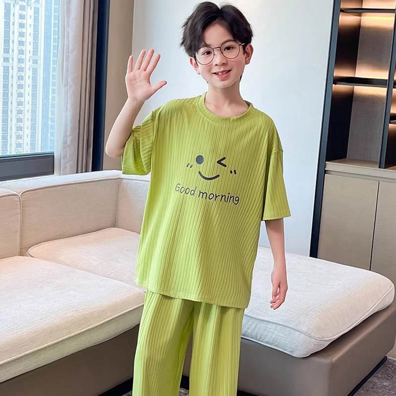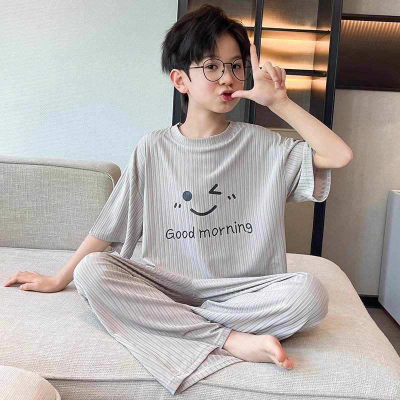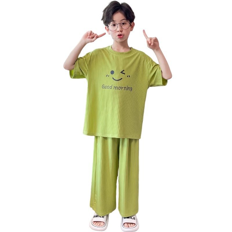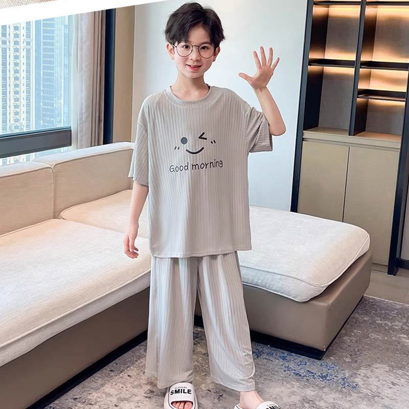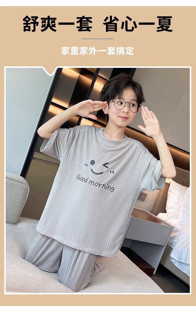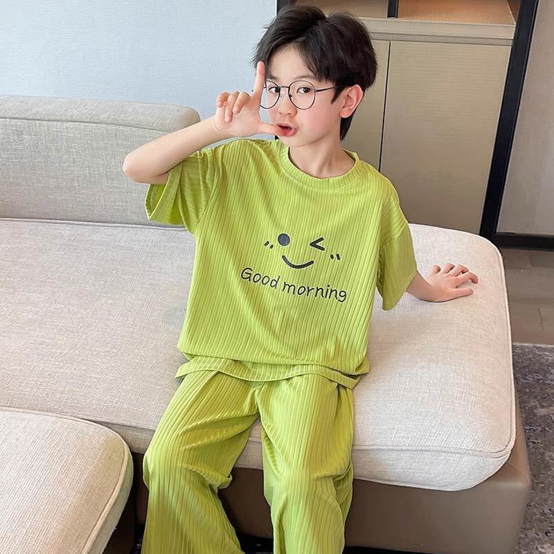 아동용 가정복 남성용 여름 신작 얼음 실크 반팔 소년 잠옷 세트 루즈한 겉옷 중대형 아동용 에어컨 의류스토어 가기
