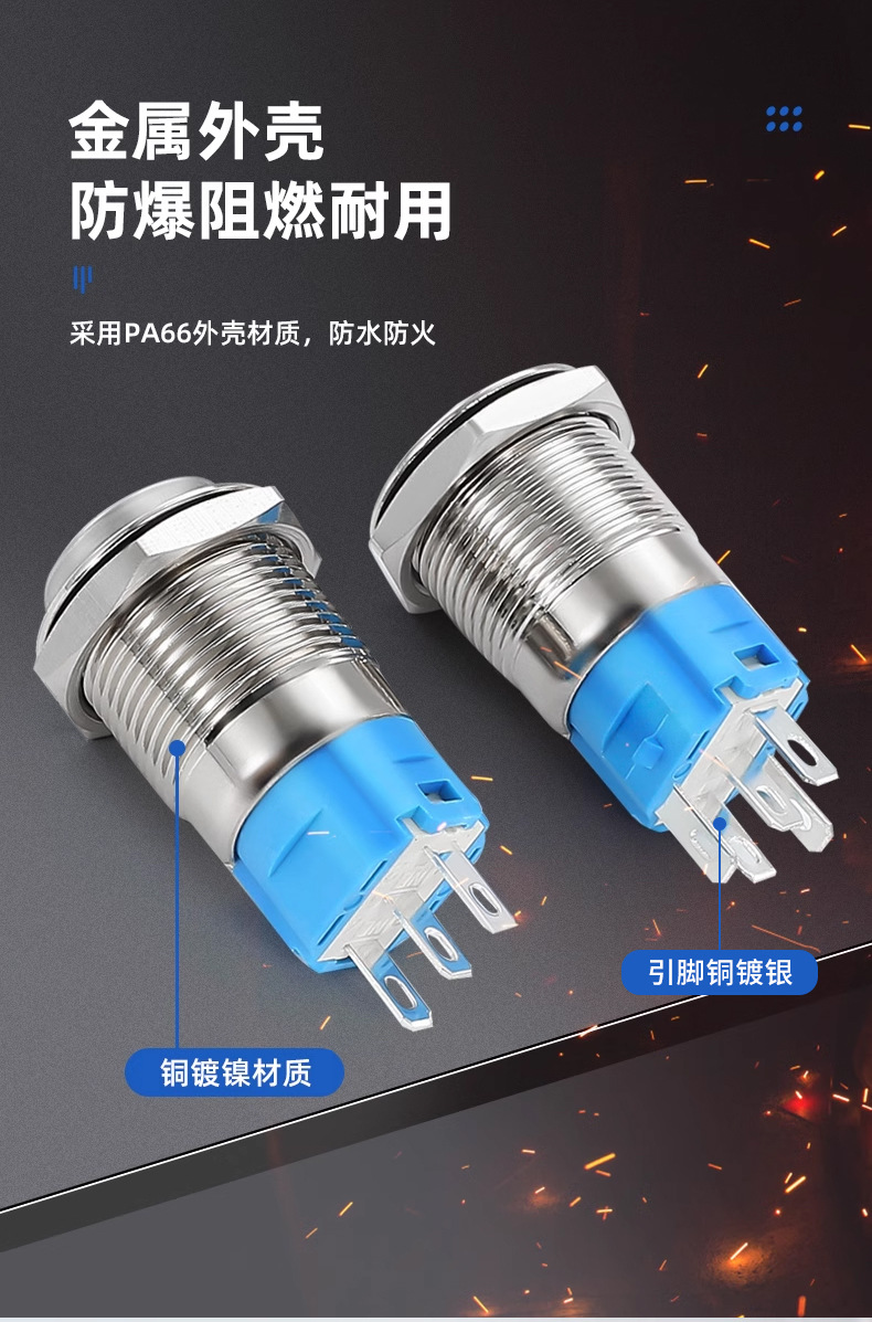 • 16mm丨자동 잠금-12-24V丨와이어 링 없음丨블루 라이트