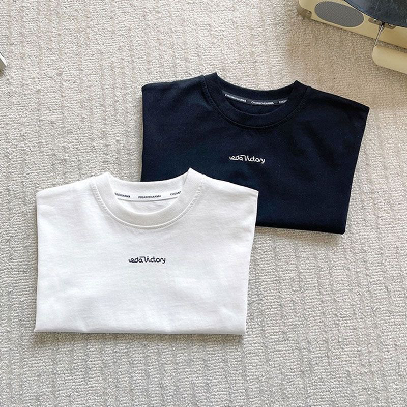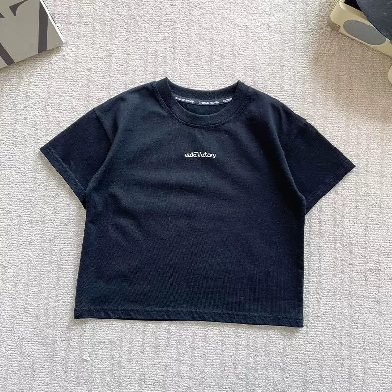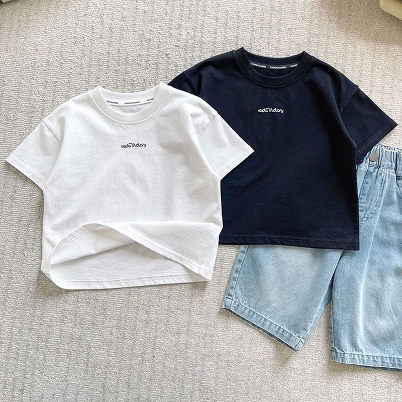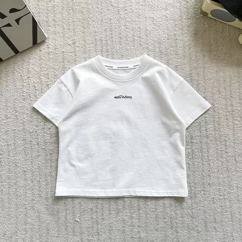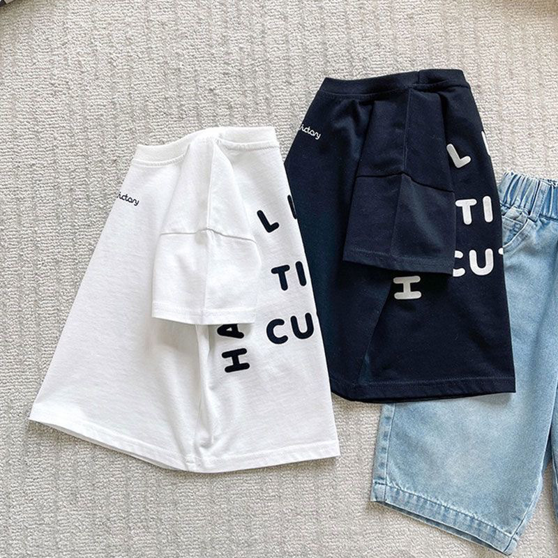 어린이 알파벳 인쇄 순수 코튼 여름 반팔 새로운 스타일 2025 소년과 소녀 스타일 반팔 느슨한 베이비 탑스토어 가기