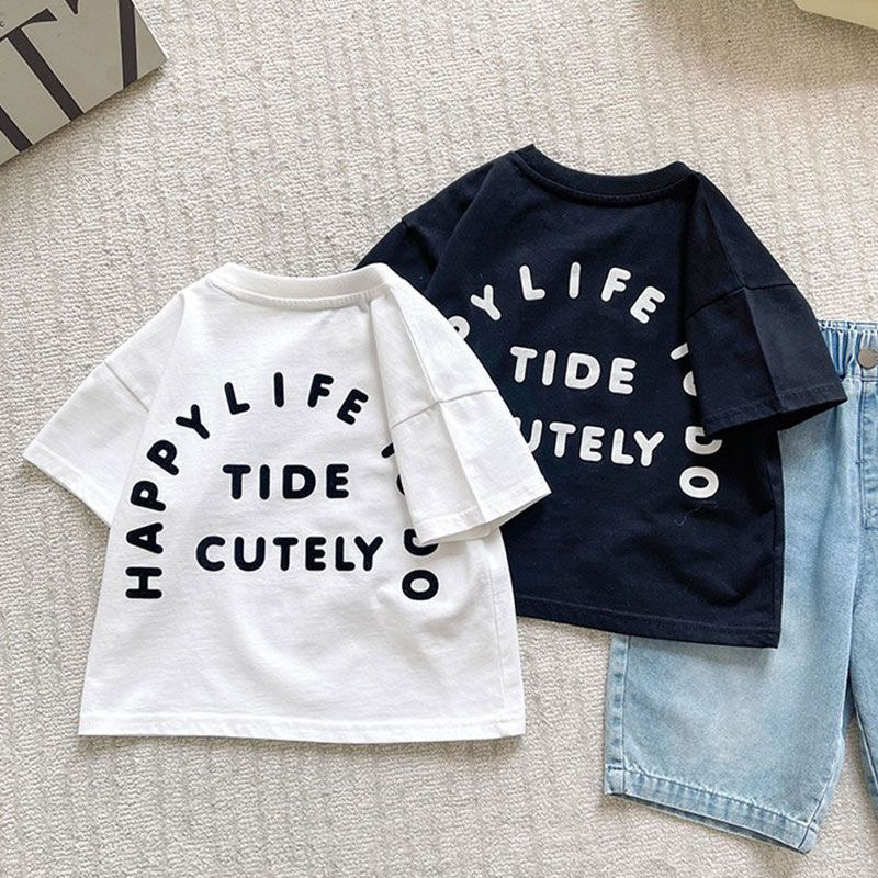 어린이 알파벳 인쇄 순수 코튼 여름 반팔 새로운 스타일 2025 소년과 소녀 스타일 반팔 느슨한 베이비 탑
