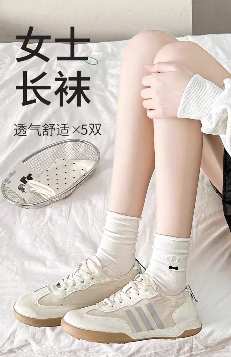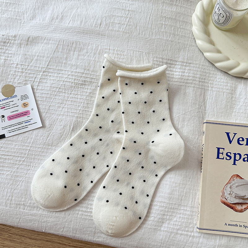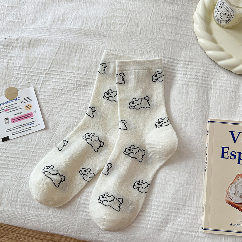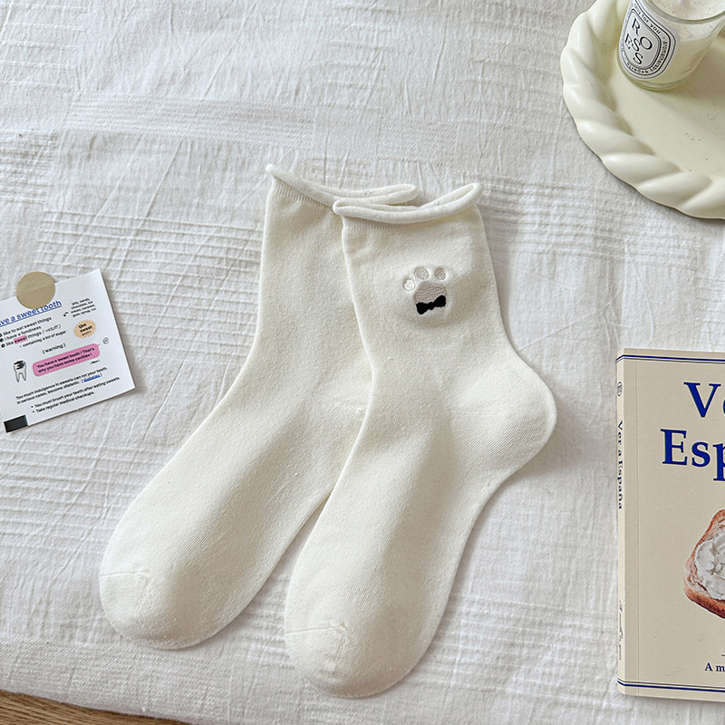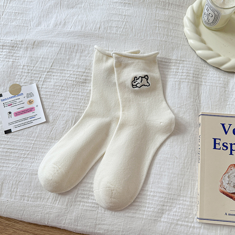 여성용 자수 강아지 양말, 인스타 감성 중목 양말, 순면, 주름 장식, 통기성, 땀 흡수, 냄새 방지, 인스타 스타일, 다용도