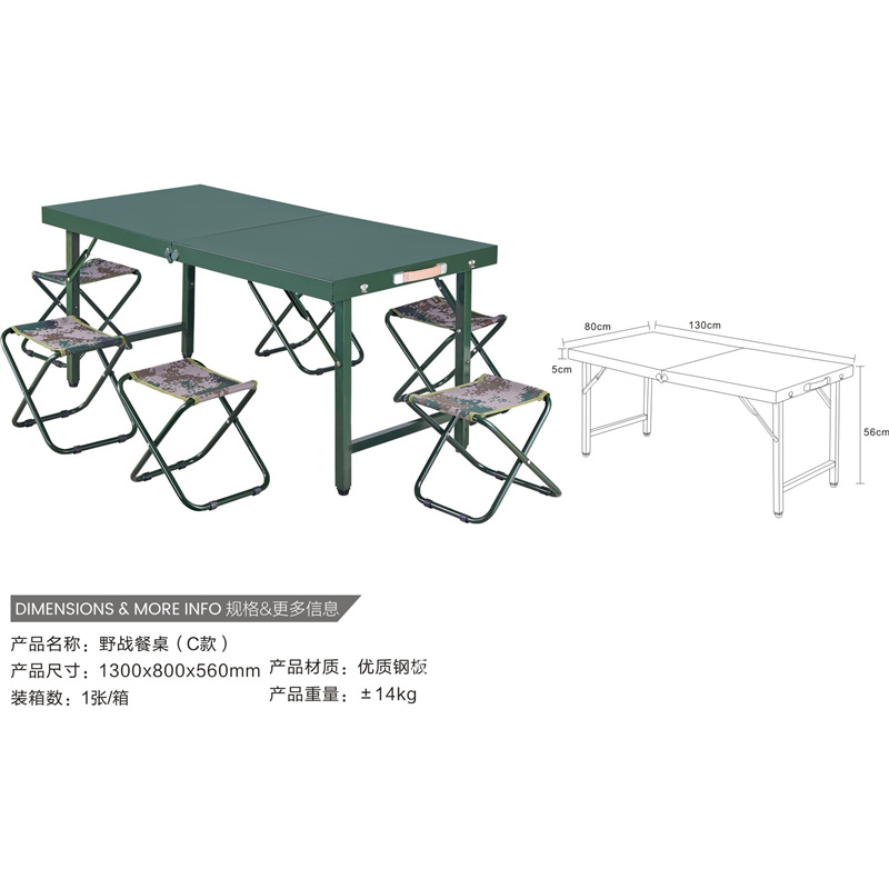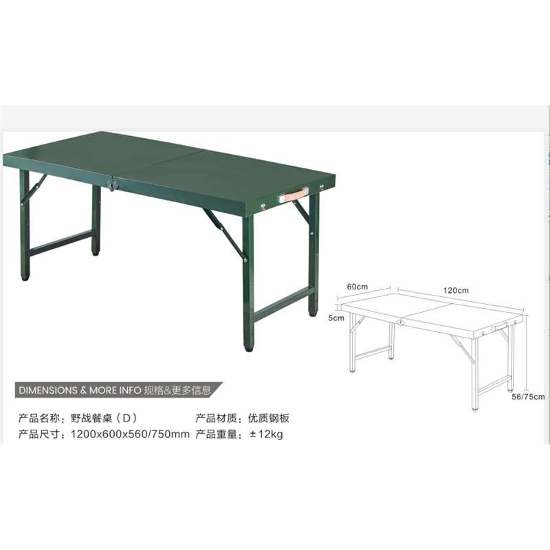 本产品图片全为实图拍质量保证 ,本店产品量大从优,也可来样定做。 产品名称:野战餐桌 产品规格:1300*800*560MM /1200*600*560MM 产品材质:优质钢板