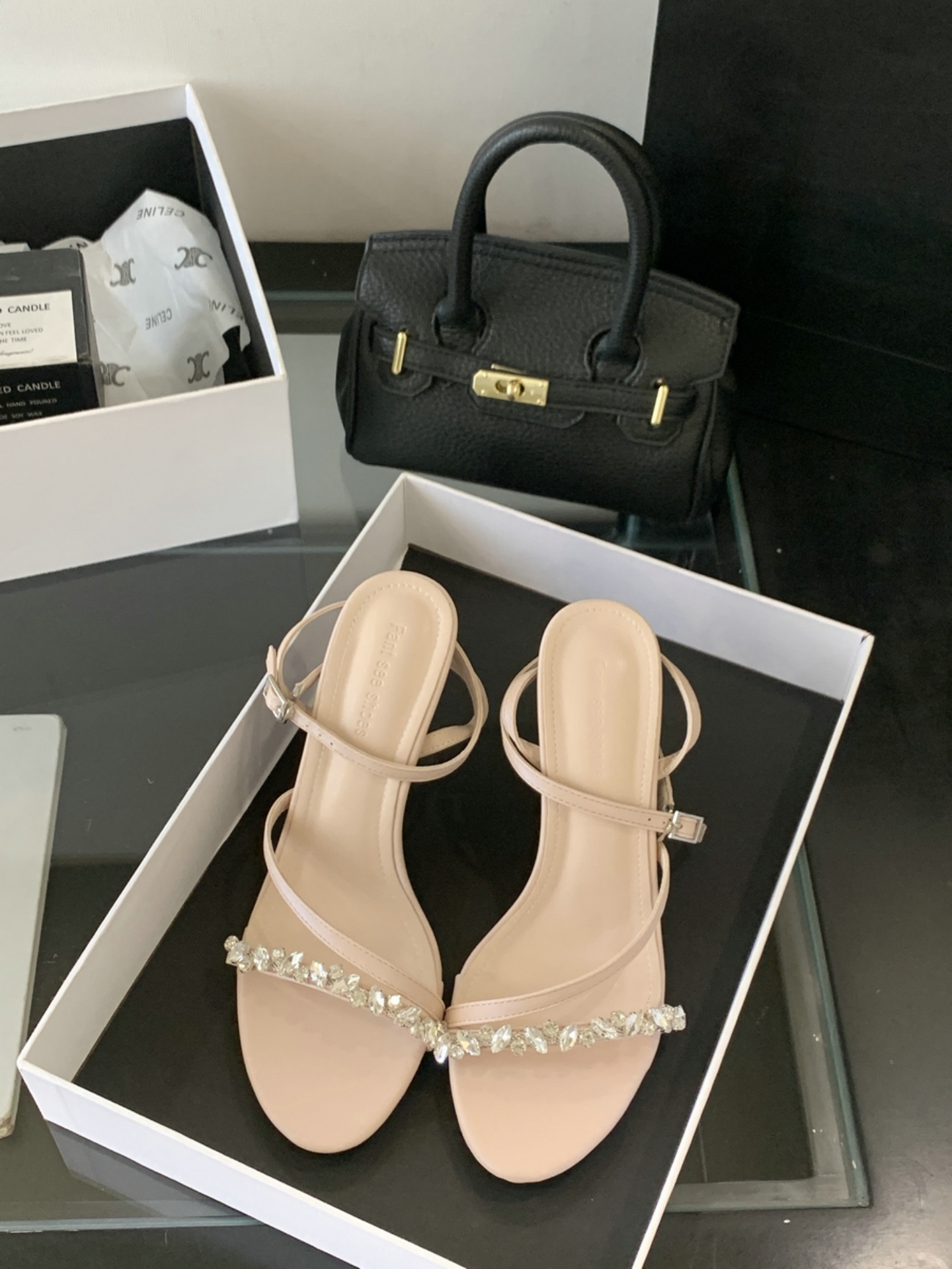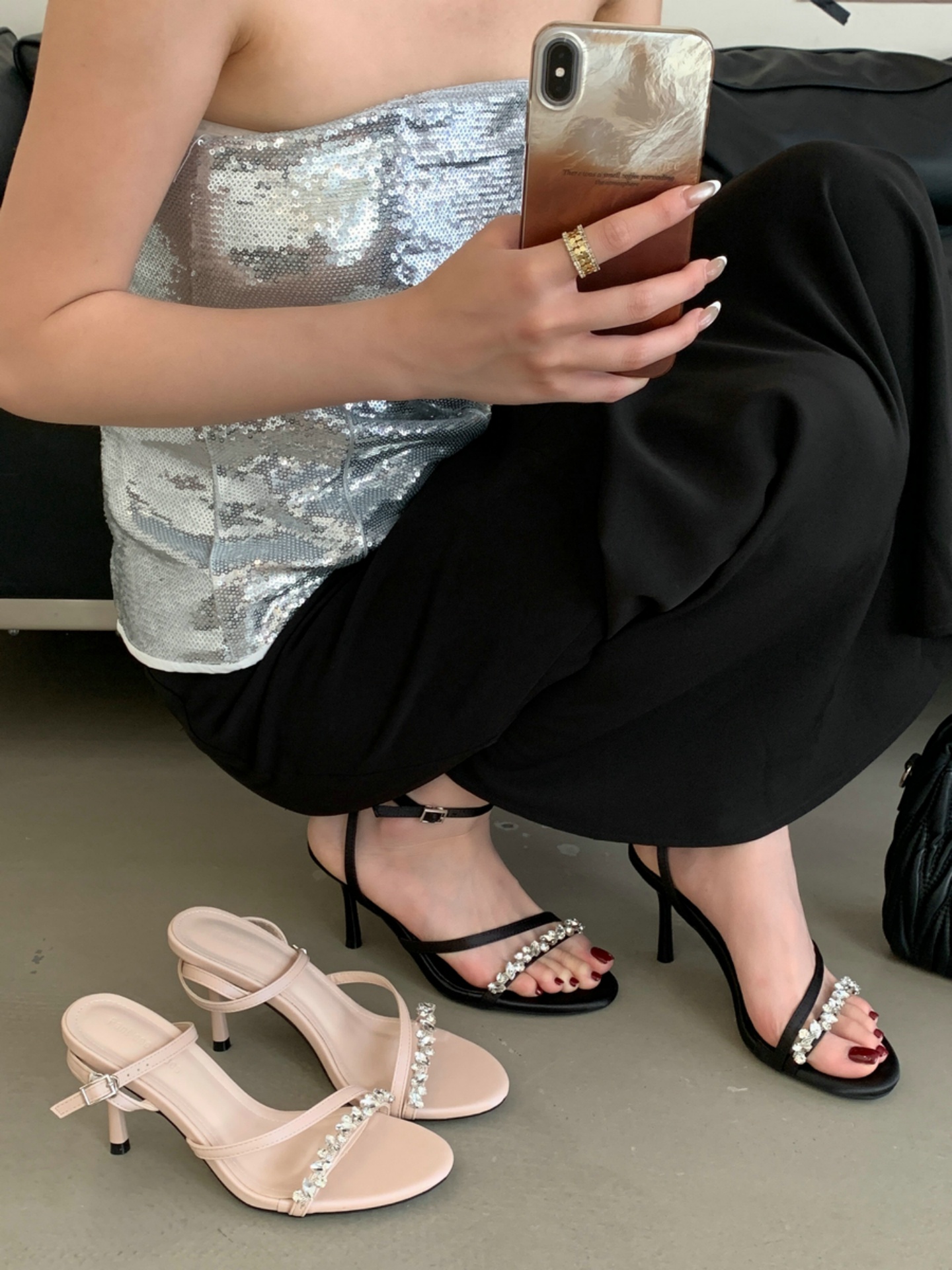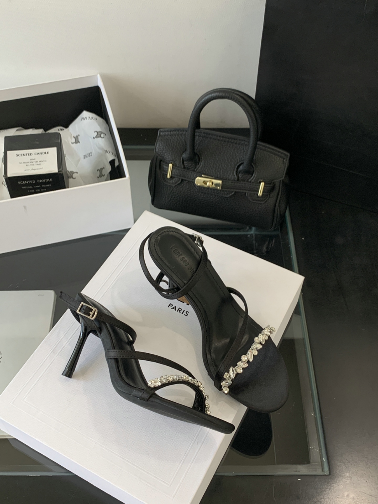 샌들 여성 디자인 틈새 시장 2025 새로운 블랙 오픈 토 라인스톤 원라인 버클 스트랩 스틸레토 여름 하이힐스토어 가기