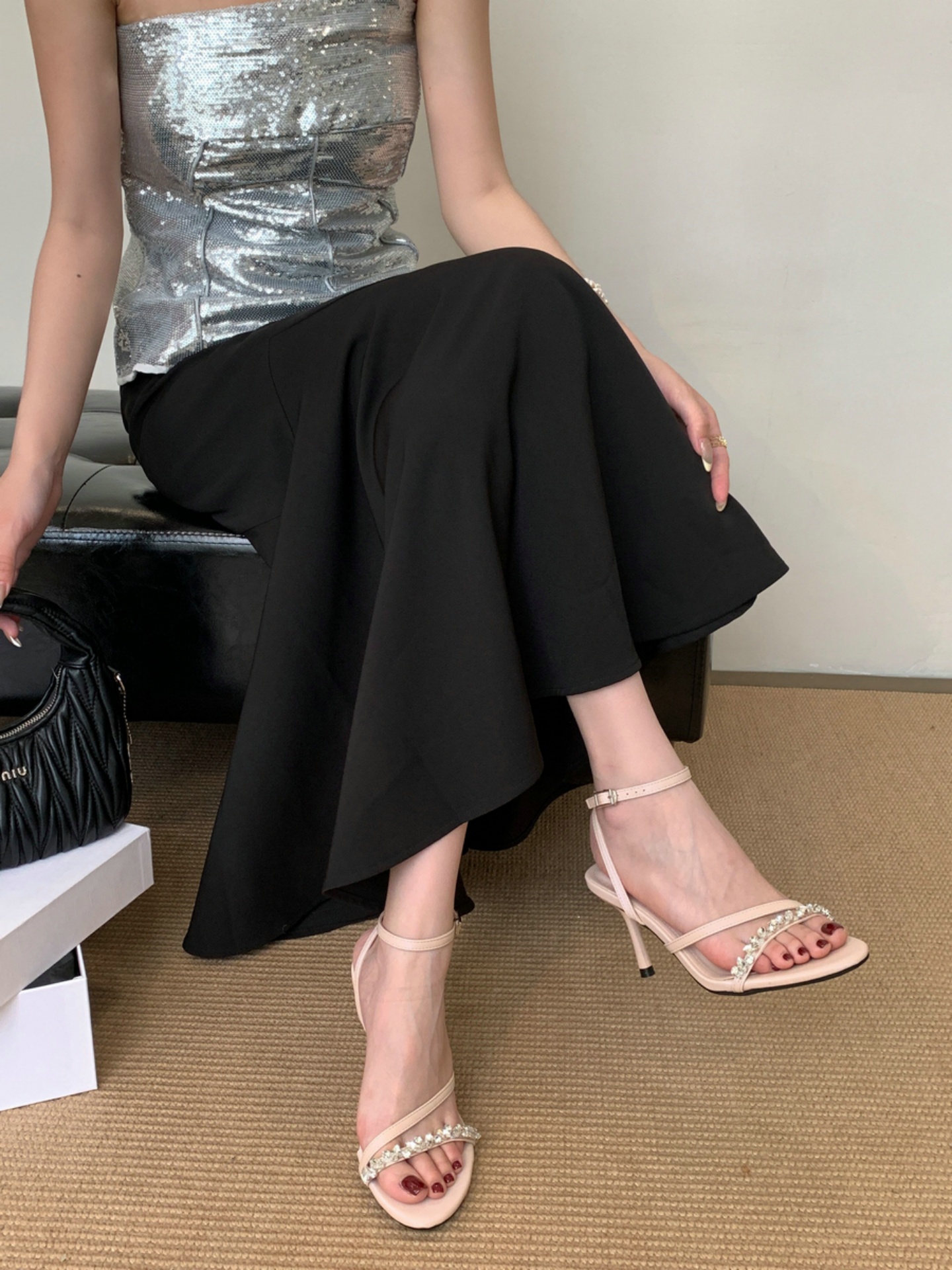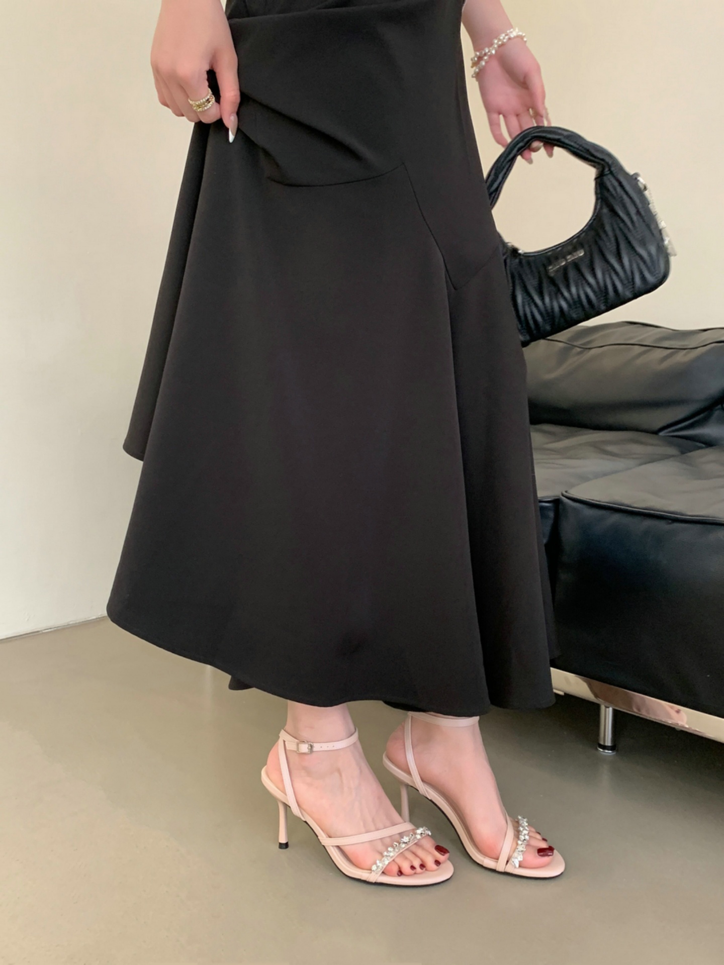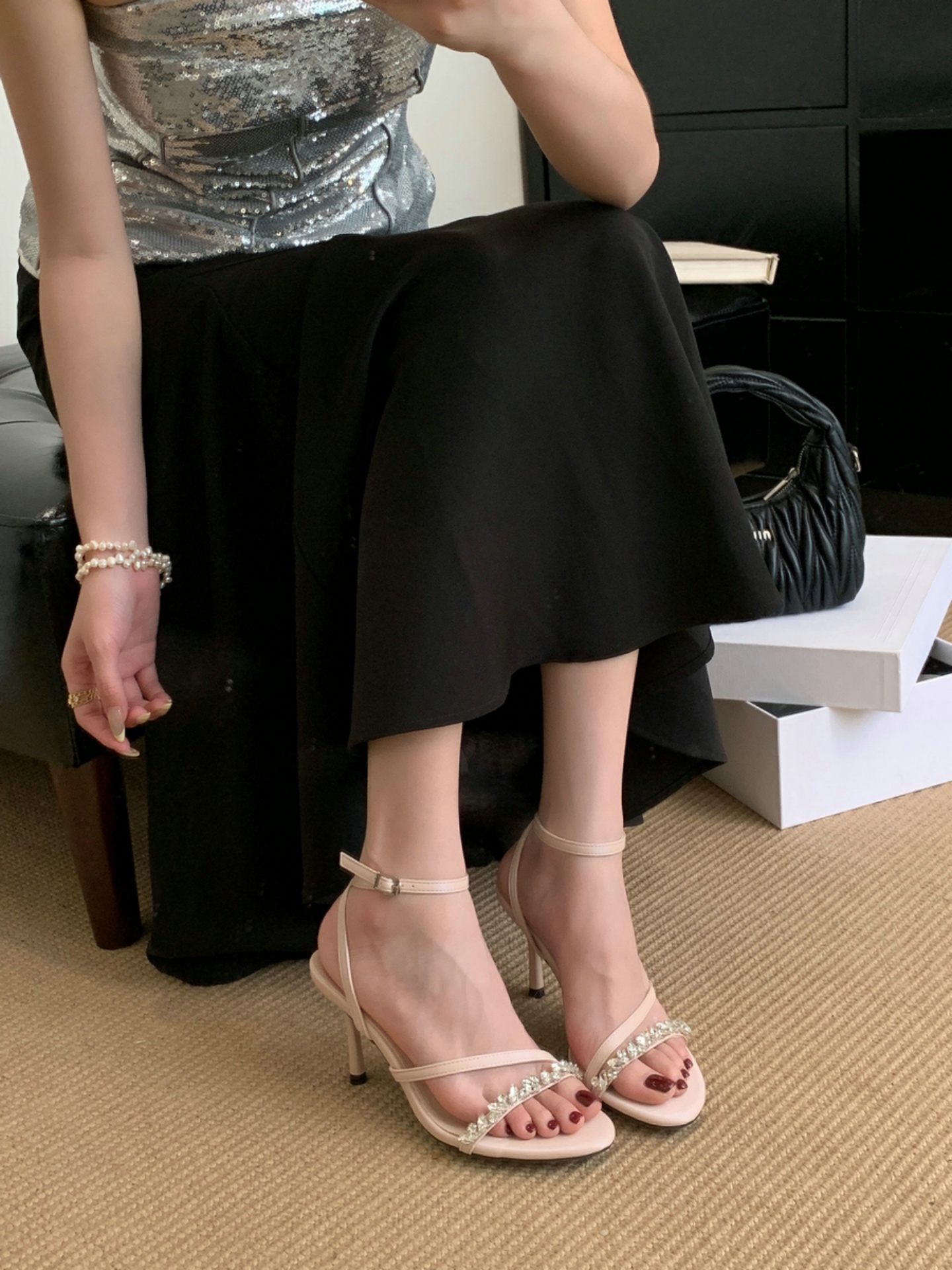 샌들 여성 디자인 틈새 시장 2025 새로운 블랙 오픈 토 라인스톤 원라인 버클 스트랩 스틸레토 여름 하이힐
