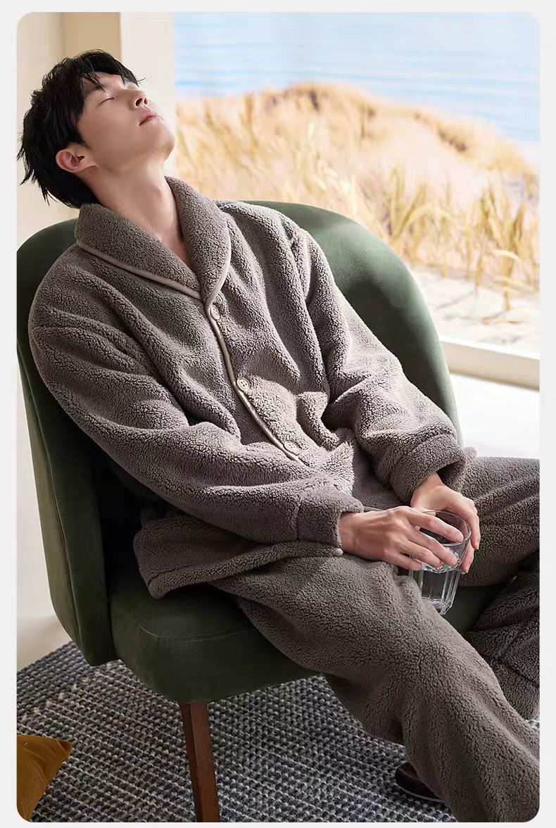2025 새로운 남성 잠옷 램스울 플러스 벨벳 두꺼운 따뜻한 가정 의류 산호 벨벳 청소년 학생 정장