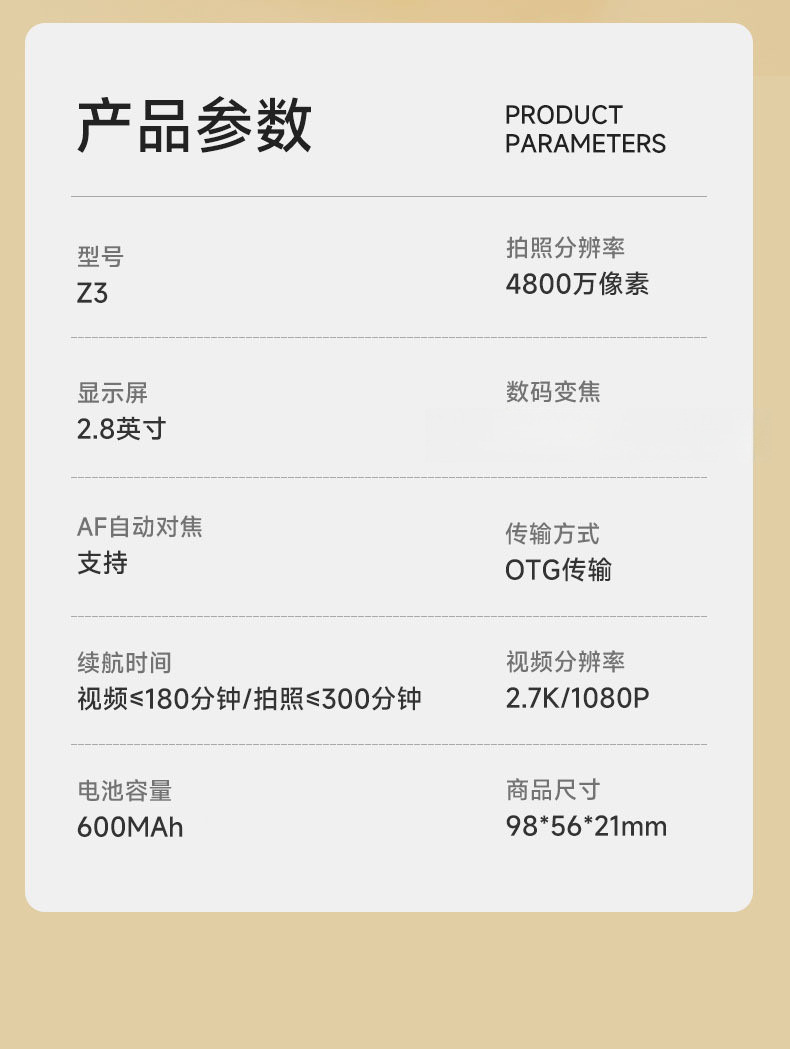 • 사용자 정의 색상 - 기본 흰색 - 뷰티 필터 + 초점이 없는 흔들림 방지 - 32G에 3,000개 이상의 사진과 비디오를 2시간 동안 저장