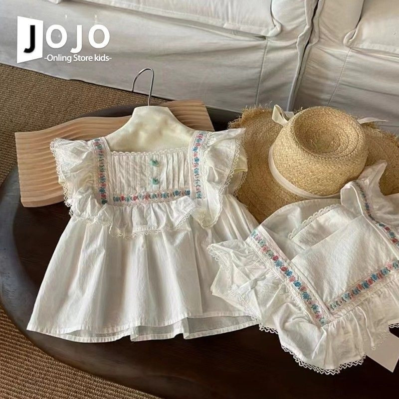 여자 반팔 셔츠 24 여름 스타일 어린이 작은 플라잉 슬리브 흰색 조끼 복고풍 레이스 청바지 인형 셔츠