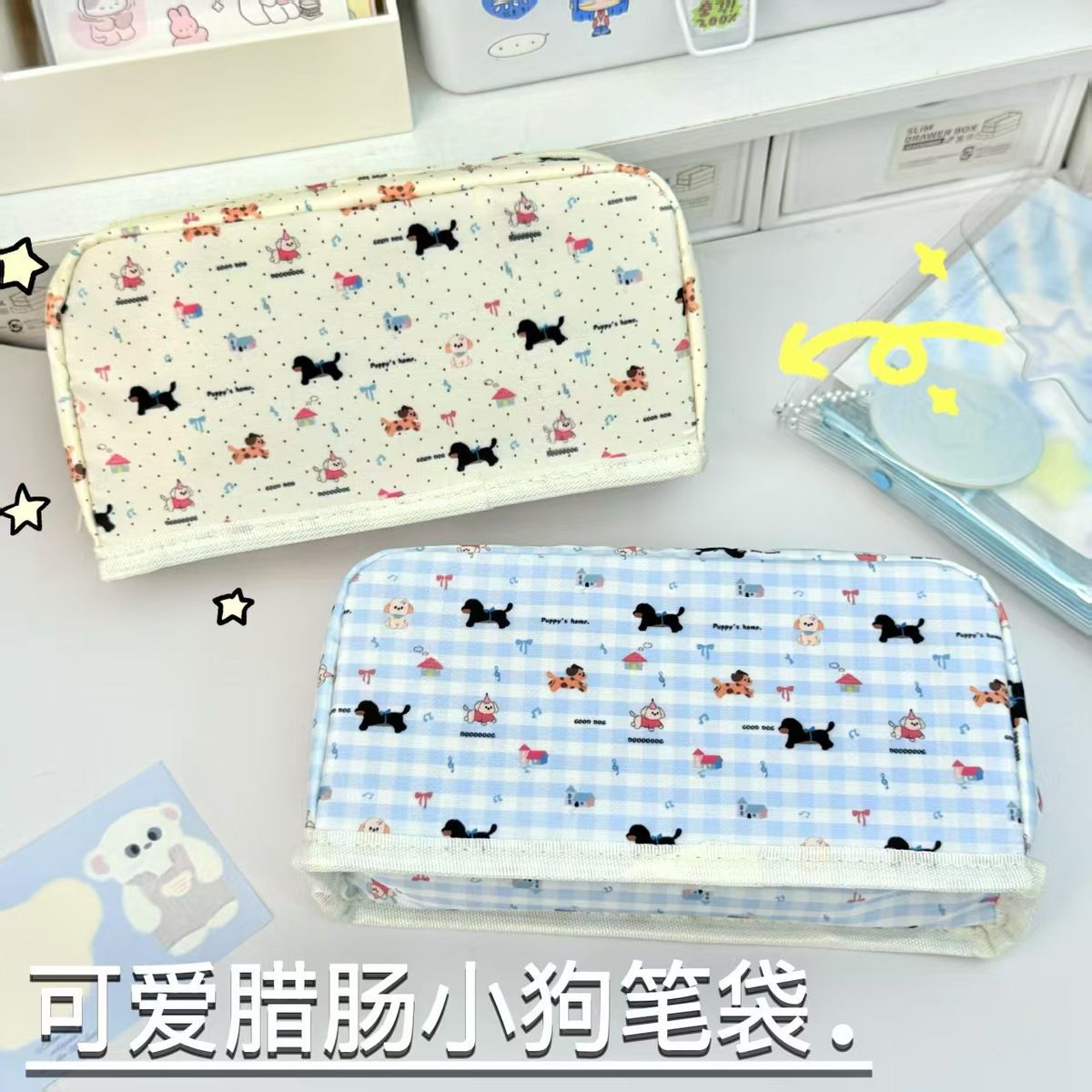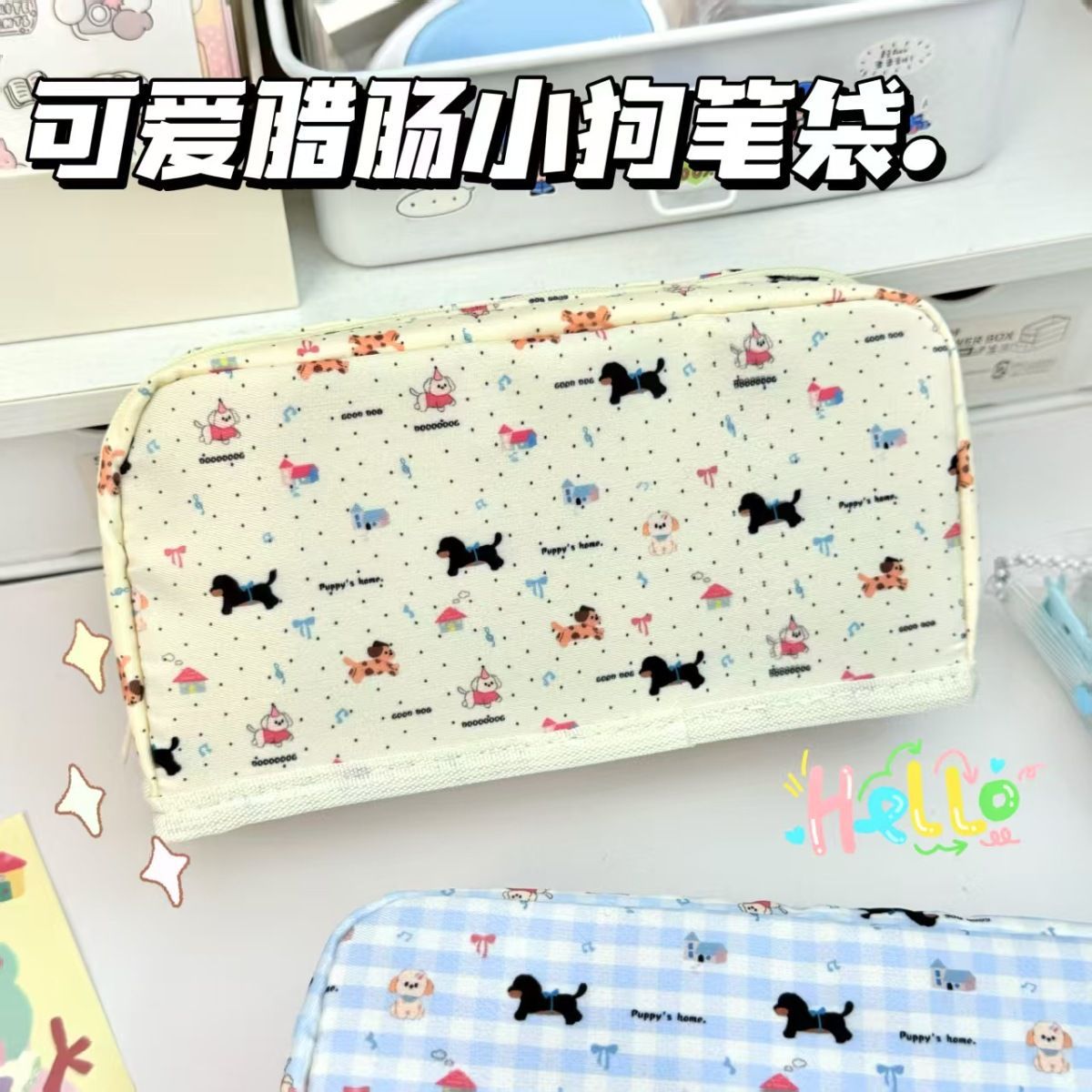 샤오홍슈와 같은 체크무늬 닥스훈트 강아지 필통, 작고 신선하고 고급스러운 심플한 필통, 통백 필통스토어 가기