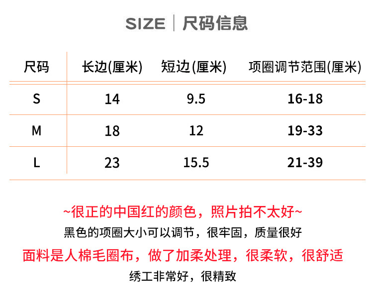 新增尺码:长边约26厘米,短边约18厘米,颈围调节范围约25-45厘米