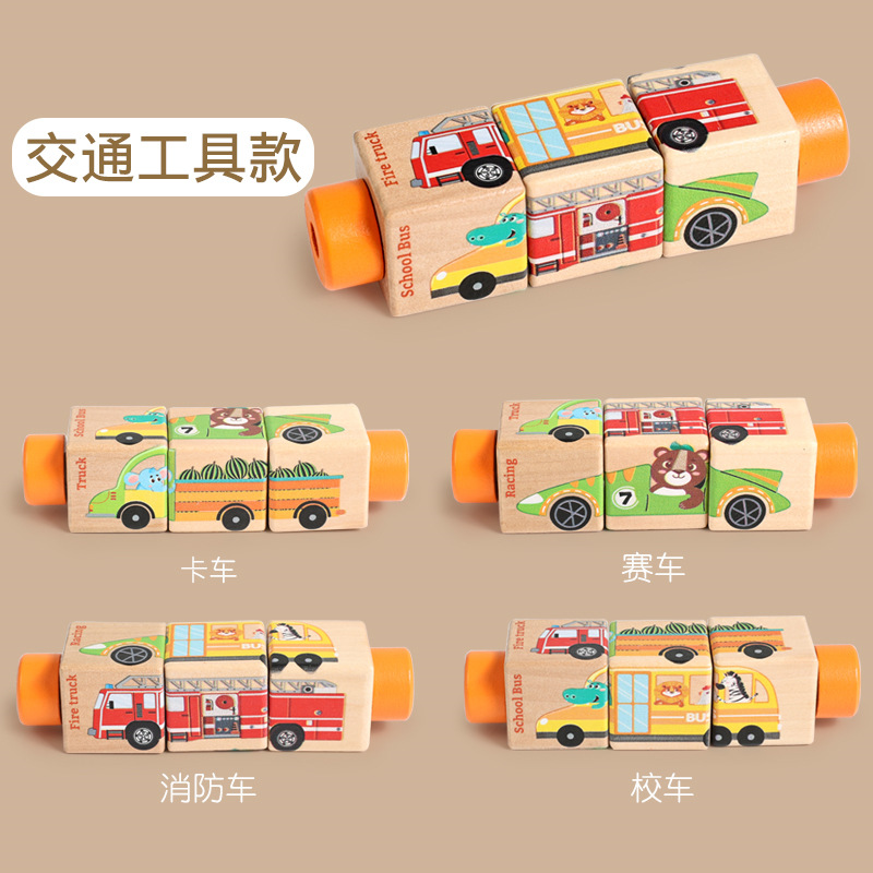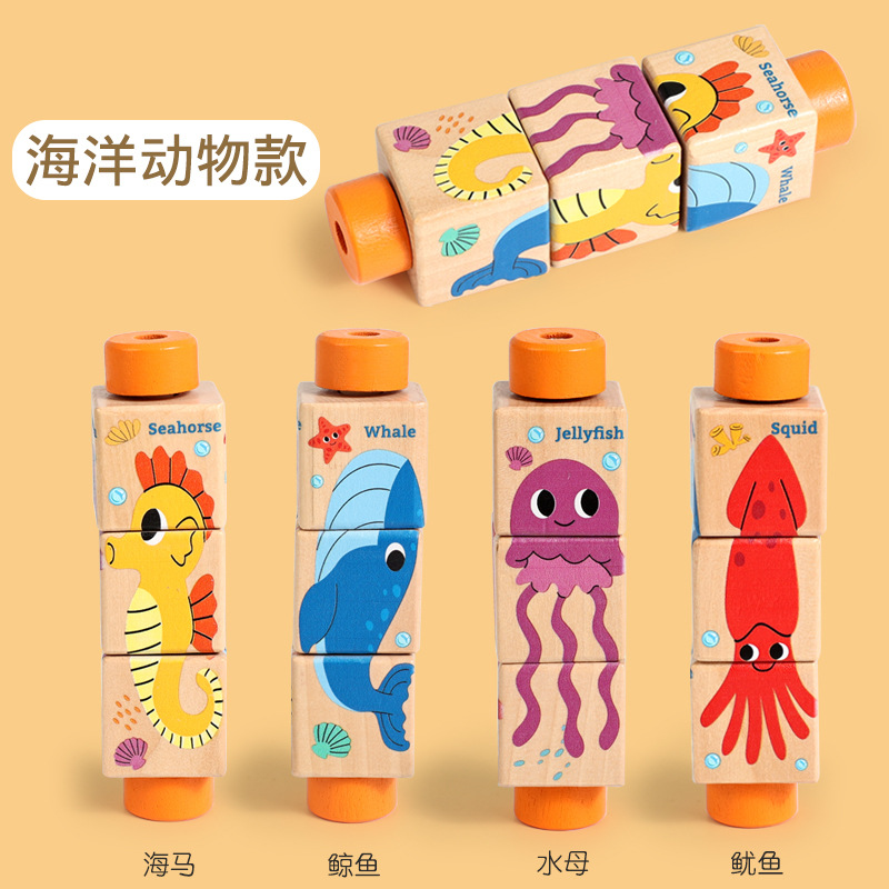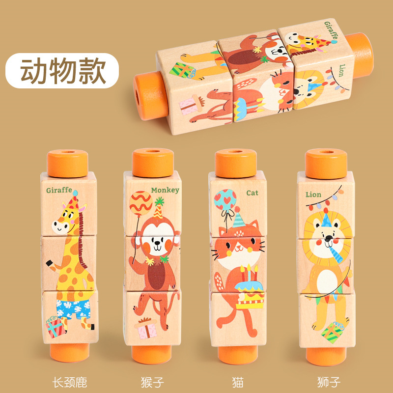 어린이 나무 동물 회전 퍼즐 입체 빌딩 블록 유치원 아기 손과 눈의 조정 훈련 교육 장난감