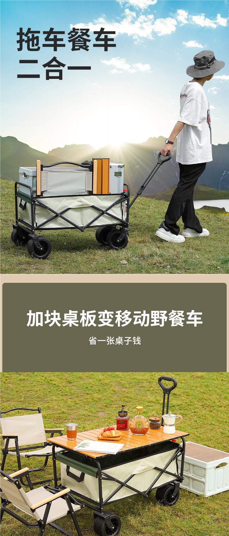 • 캠프카 + 접이식 스톨 테이블 - 대형 트레일러 탱크 휠(베이지색)