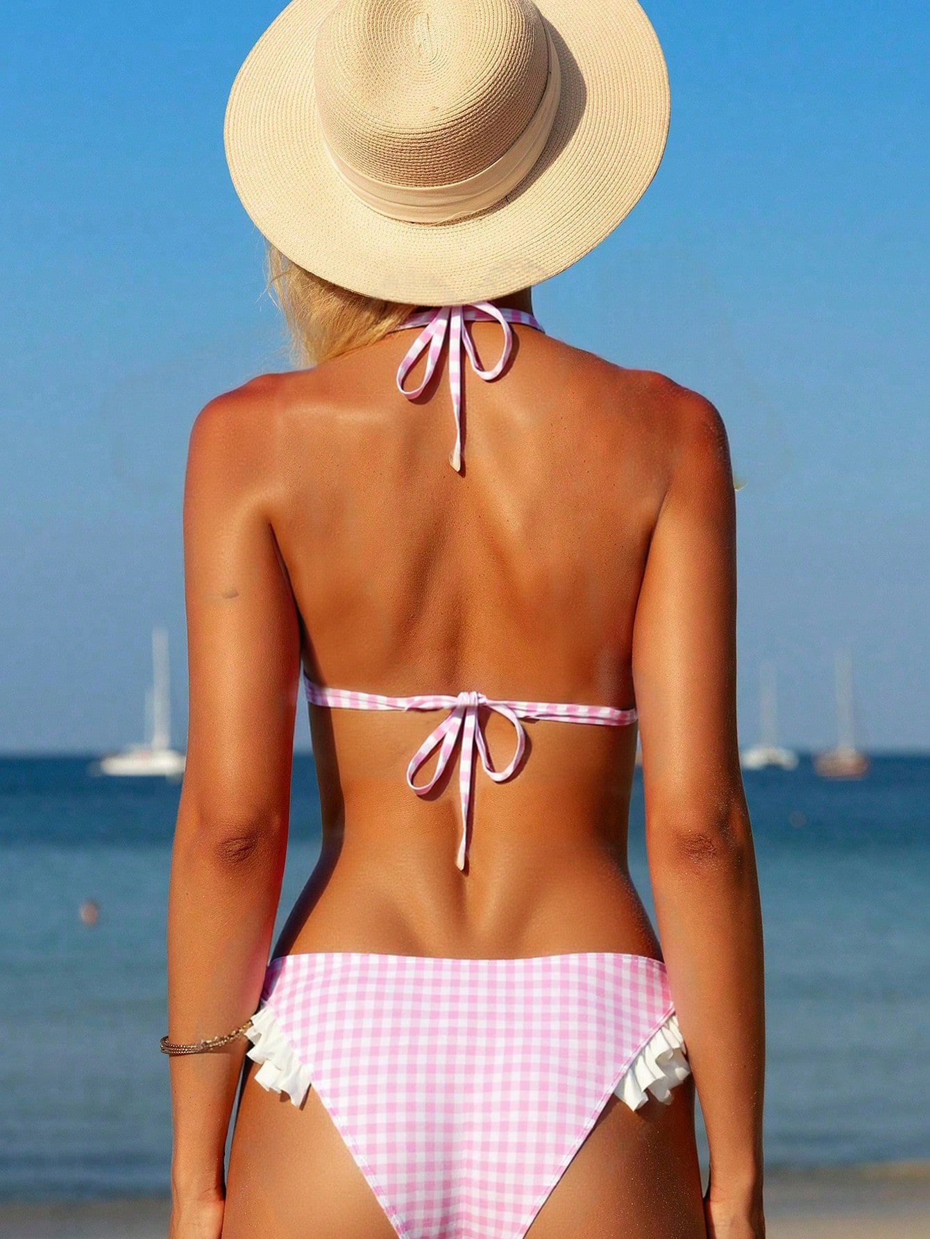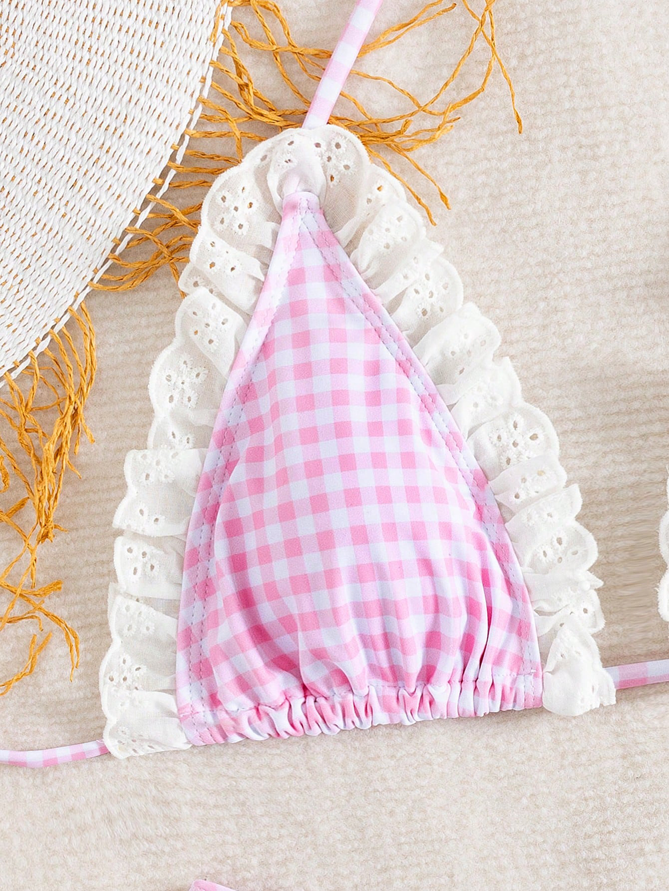 새로운 여름 유럽과 미국의 레이스 격자 무늬 홀터넥 비키니 프릴 휴가 스플릿 수영복 투피스 여성 수영복