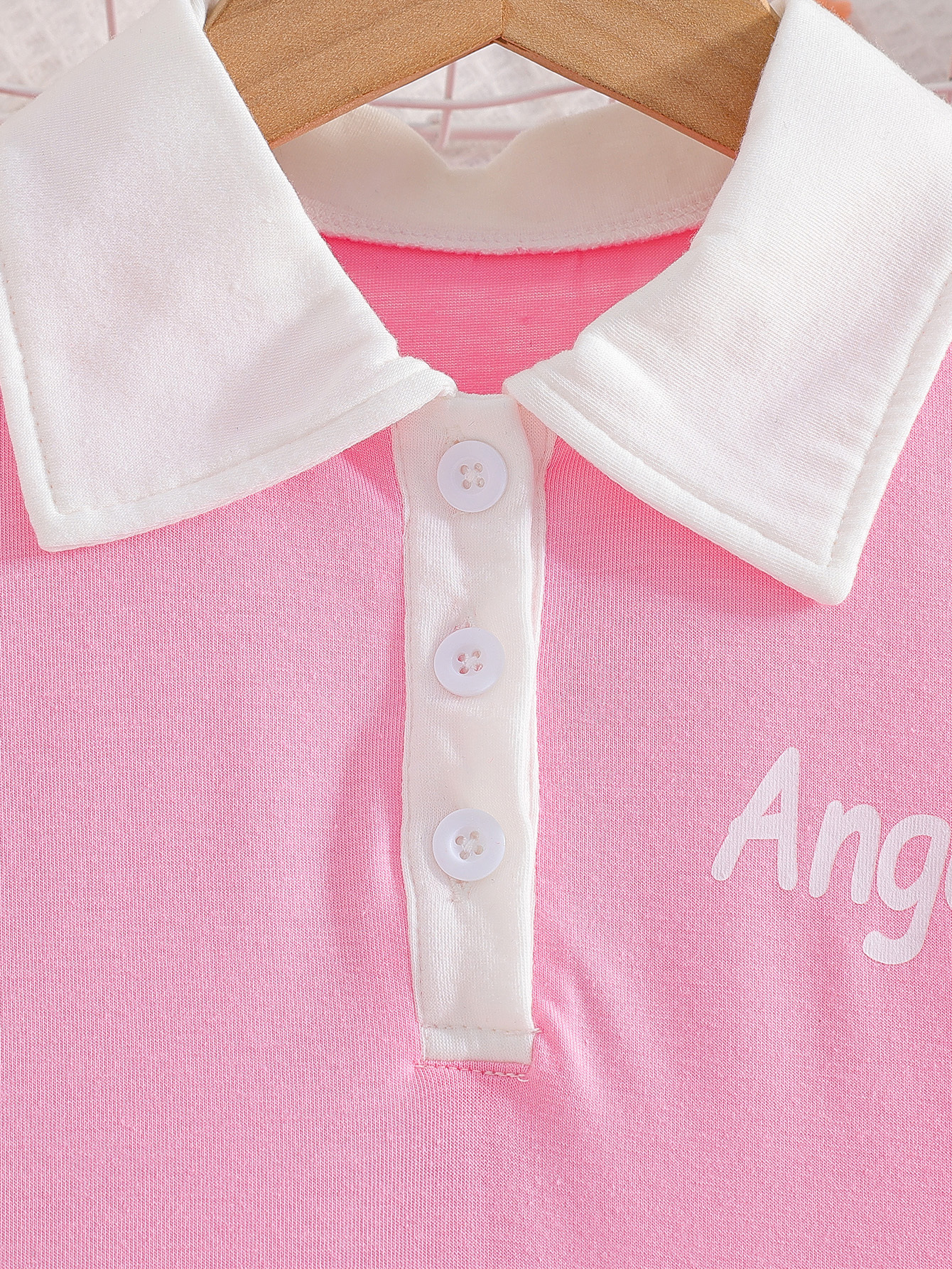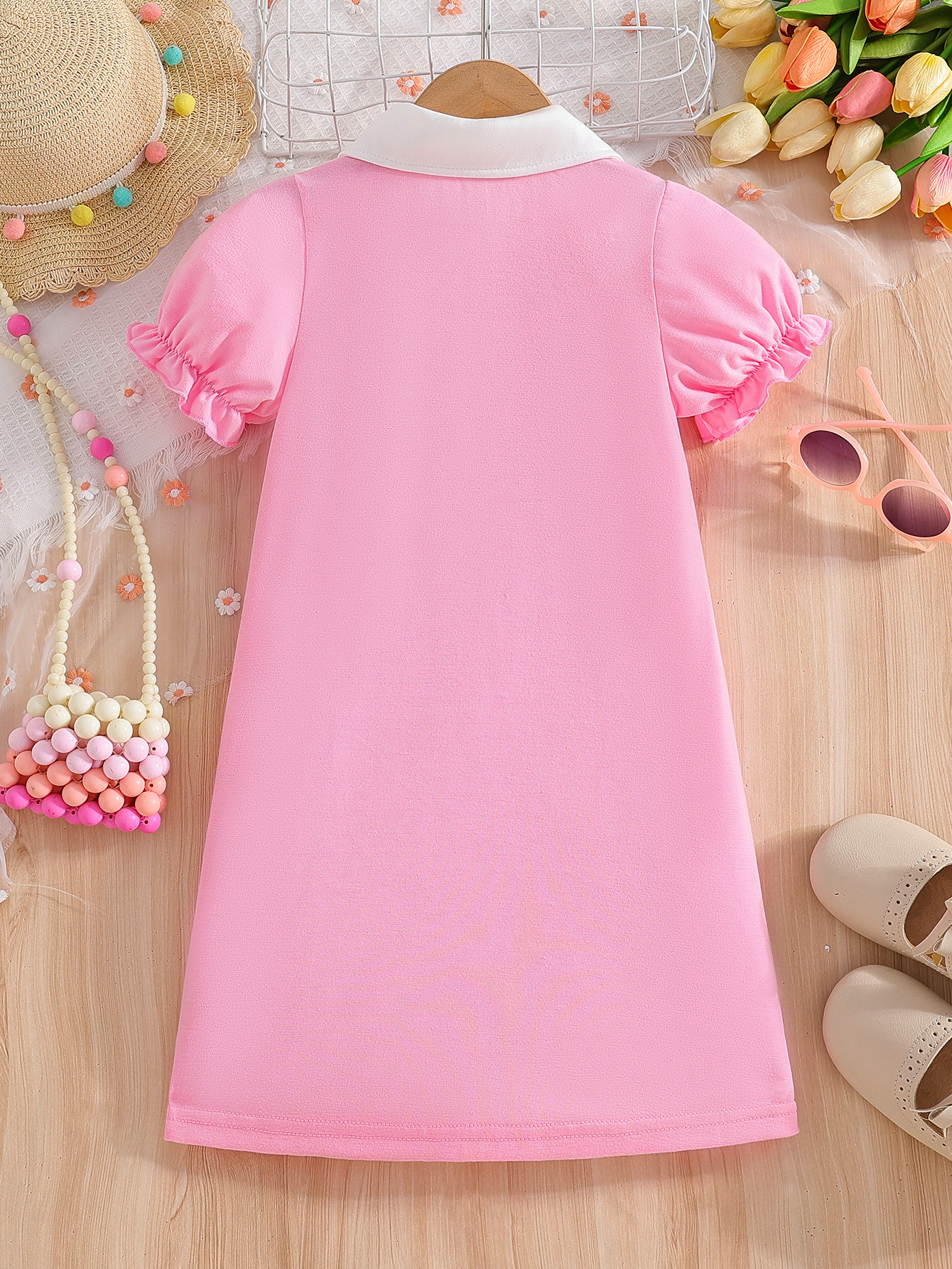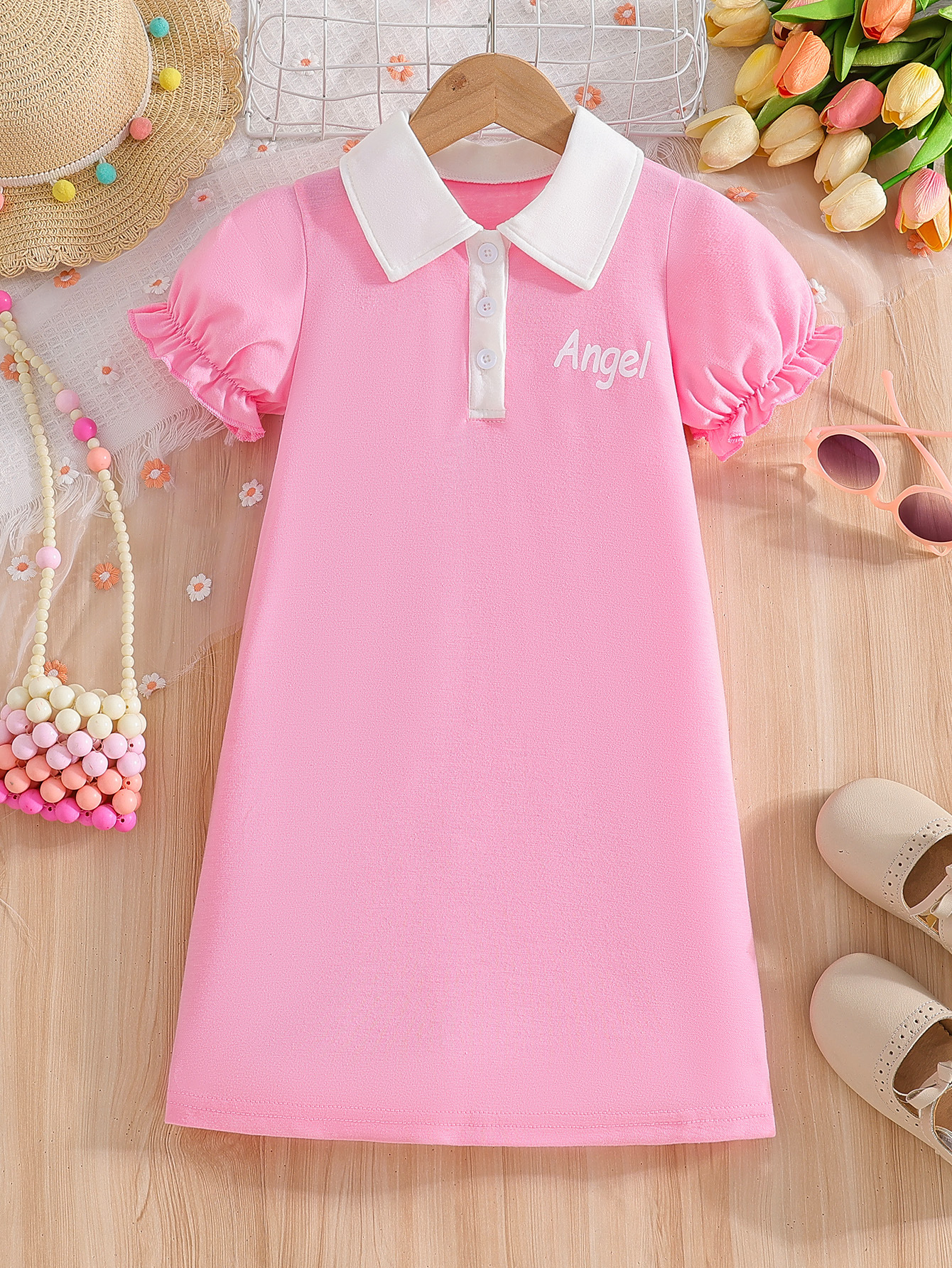 대외 무역 소녀 반팔 폴로 스커트 핑크 여름 옷깃 랜턴 슬리브 편지 인쇄 어린이 드레스스토어 가기