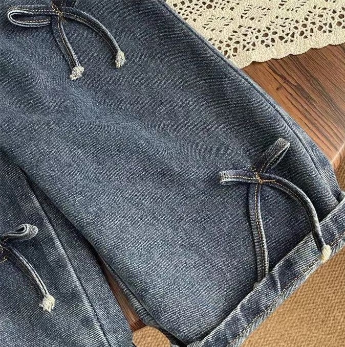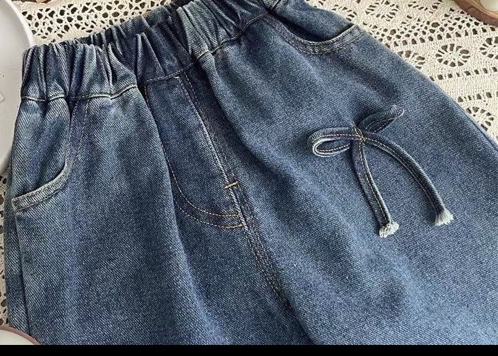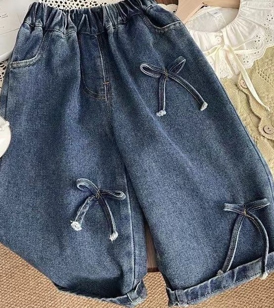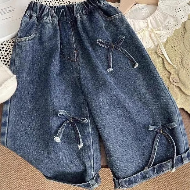2025 새로운 봄, 가을 여자 아기 느슨한 버전 어린이 한국어 나비 데님 스트레이트 바지 와이드 레그 바지