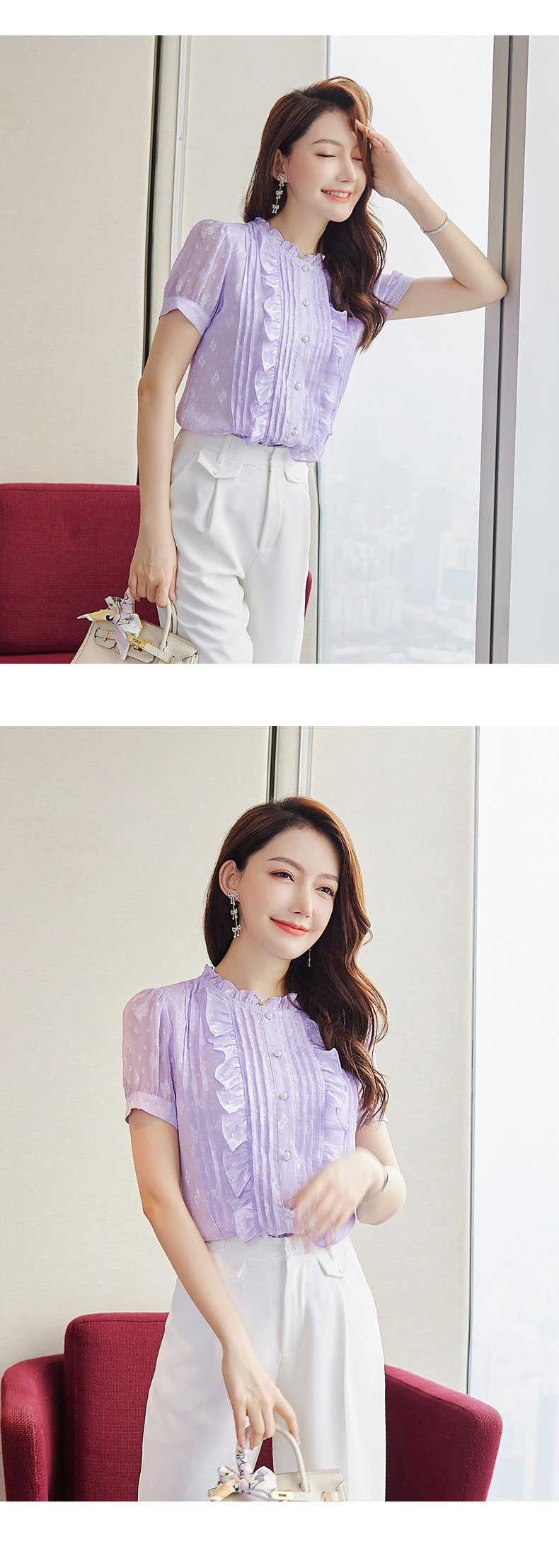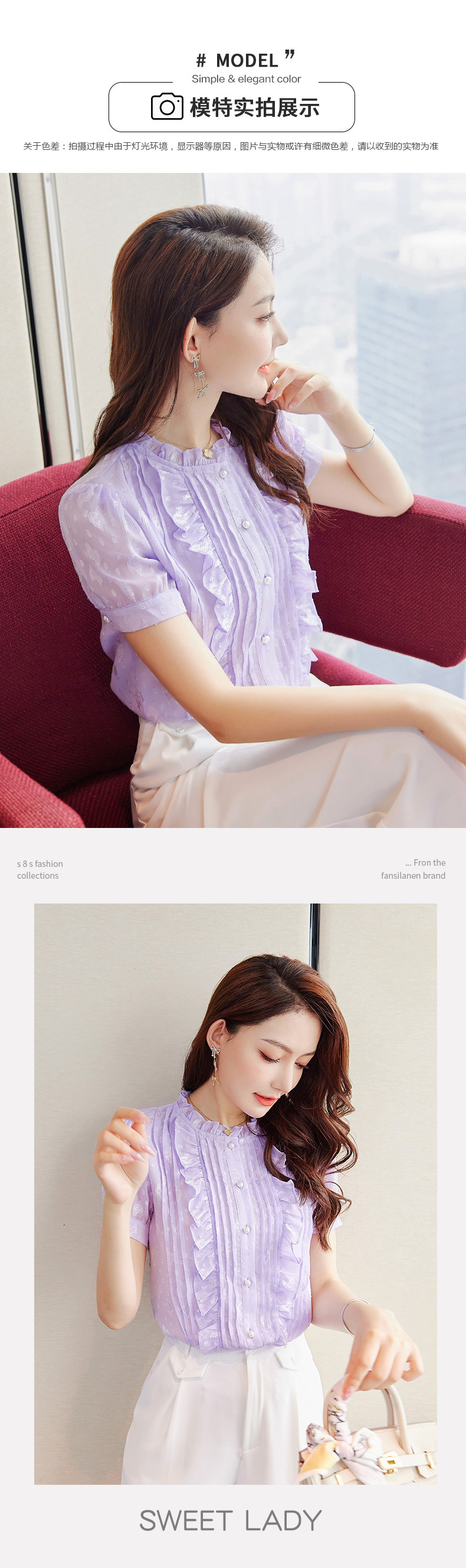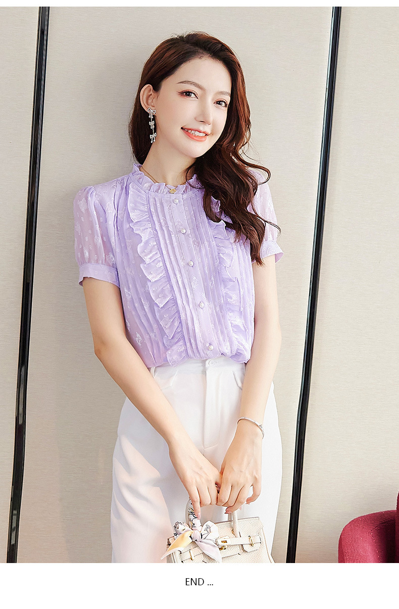 2025 스탠드 칼라 러플 반팔 쉬폰 셔츠 여성 여름 새로운 스타일 연령 감소 기질 셔츠 슬리밍 탑스토어 가기