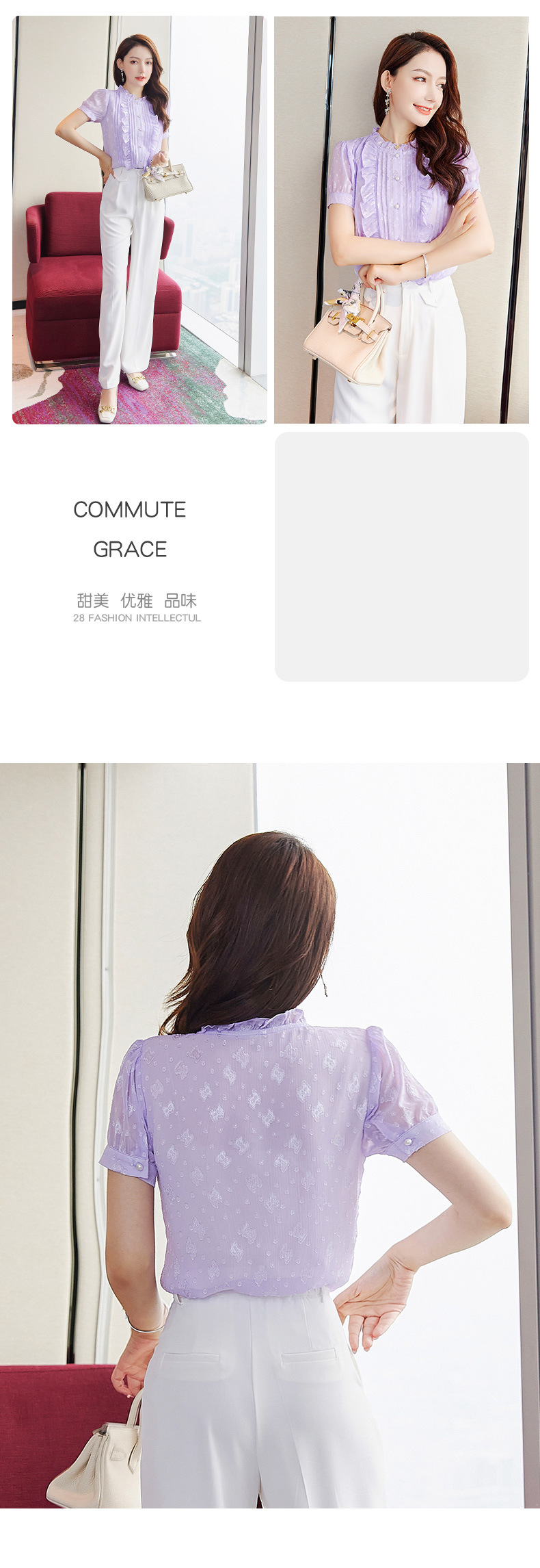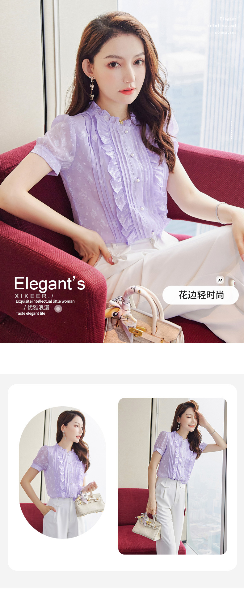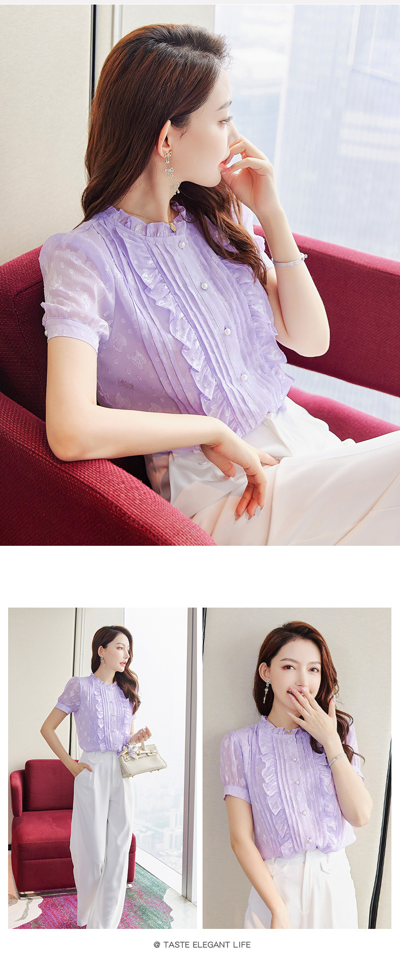 2025 스탠드 칼라 러플 반팔 쉬폰 셔츠 여성 여름 새로운 스타일 연령 감소 기질 셔츠 슬리밍 탑스토어 가기