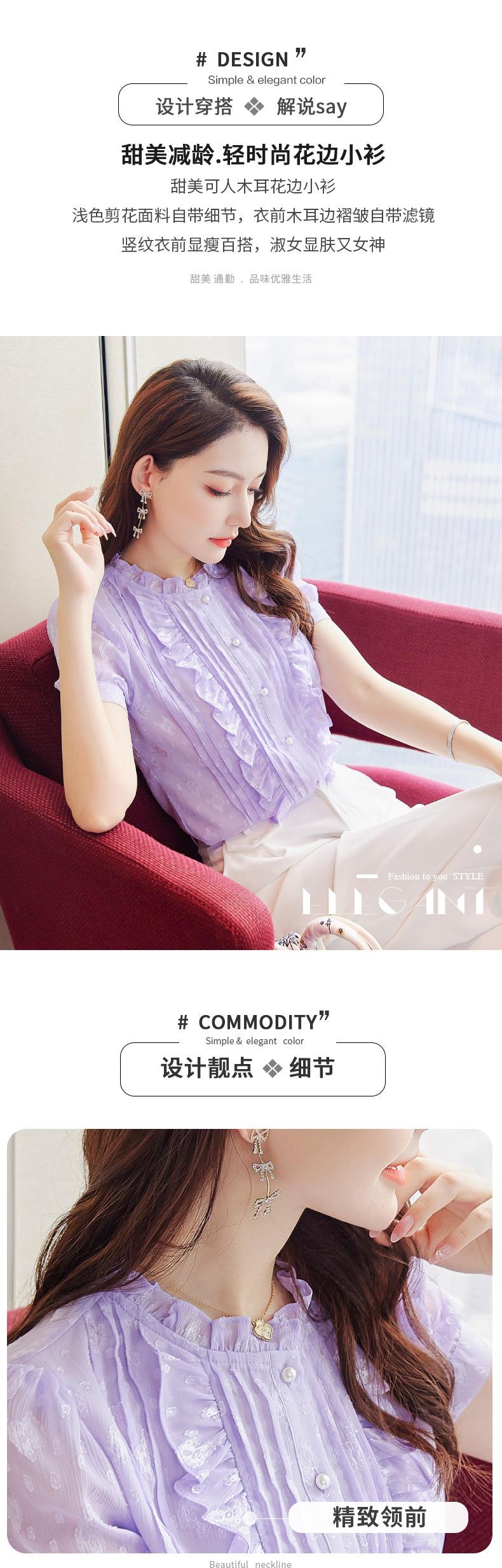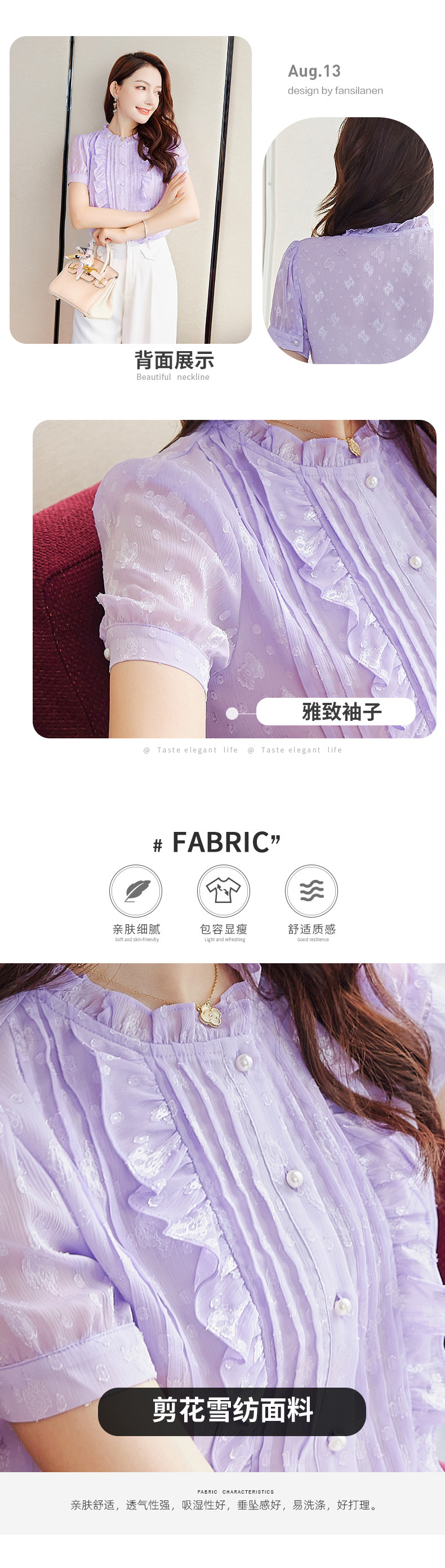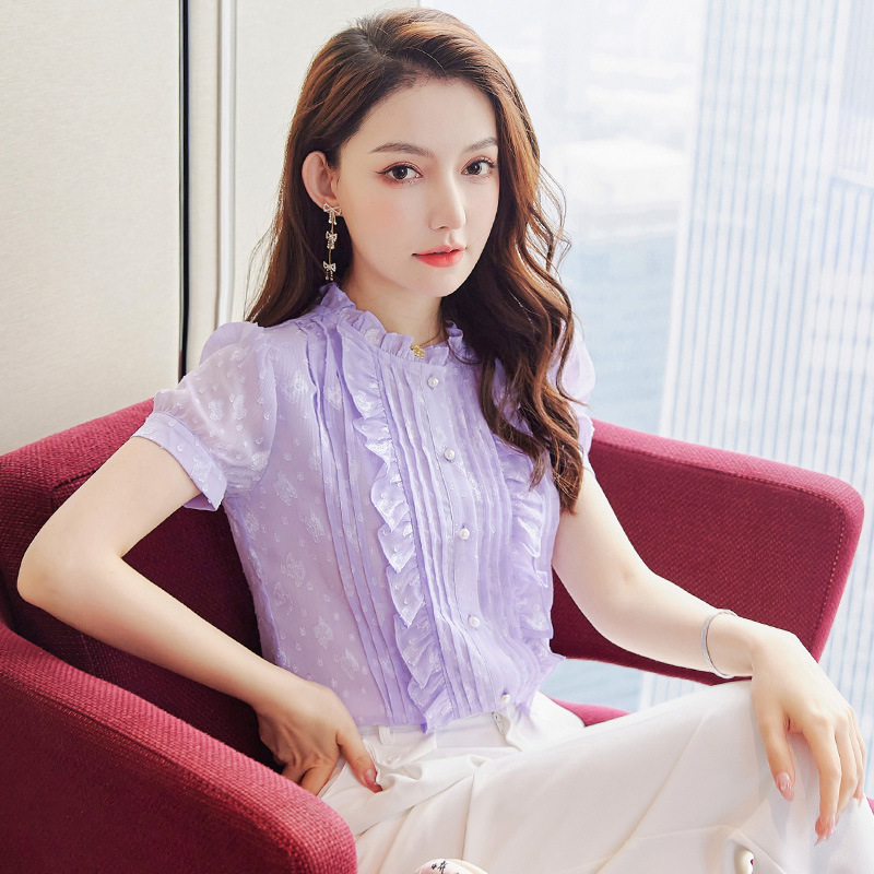 2025 스탠드 칼라 러플 반팔 쉬폰 셔츠 여성 여름 새로운 스타일 연령 감소 기질 셔츠 슬리밍 탑