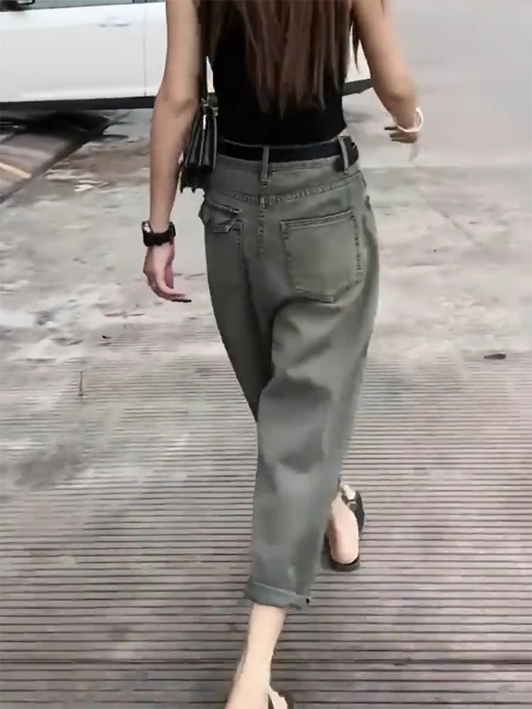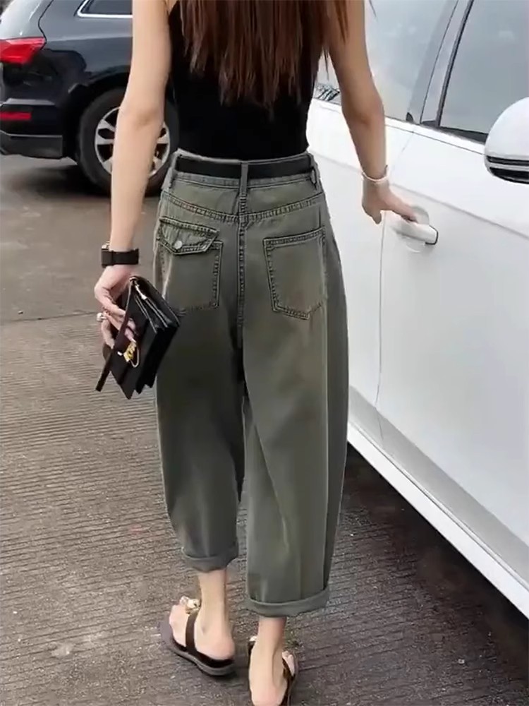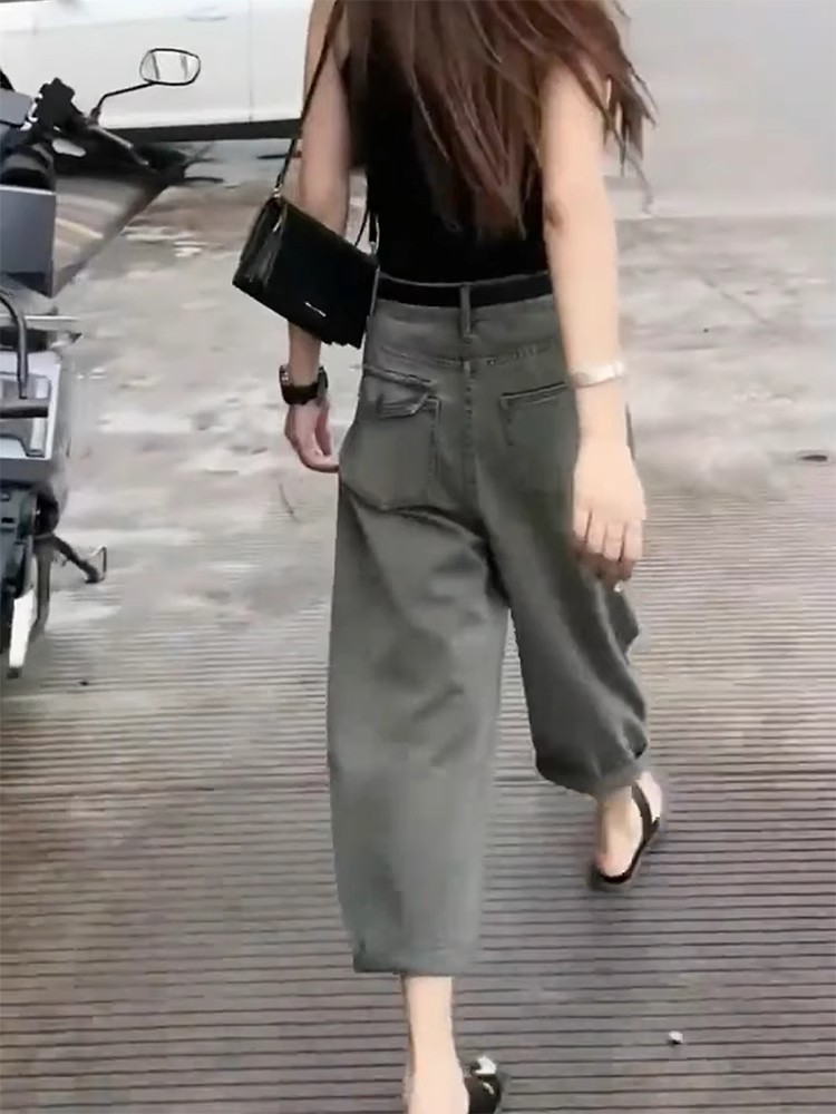여름 여성을 위한 아메리칸 스트리트 홍콩 스타일 복고풍 와이드 레그 청바지 얇고 살찐 mm 하이 웨이스트 슬리밍 9부 아빠 바지