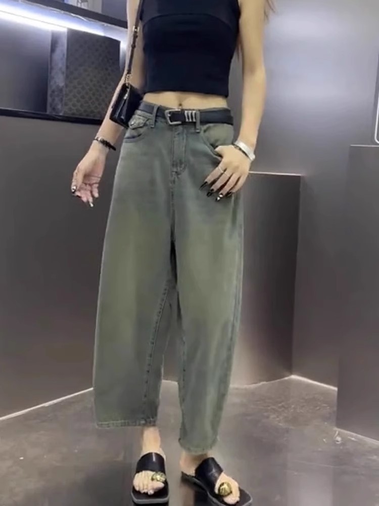 여름 여성을 위한 아메리칸 스트리트 홍콩 스타일 복고풍 와이드 레그 청바지 얇고 살찐 mm 하이 웨이스트 슬리밍 9부 아빠 바지스토어 가기
