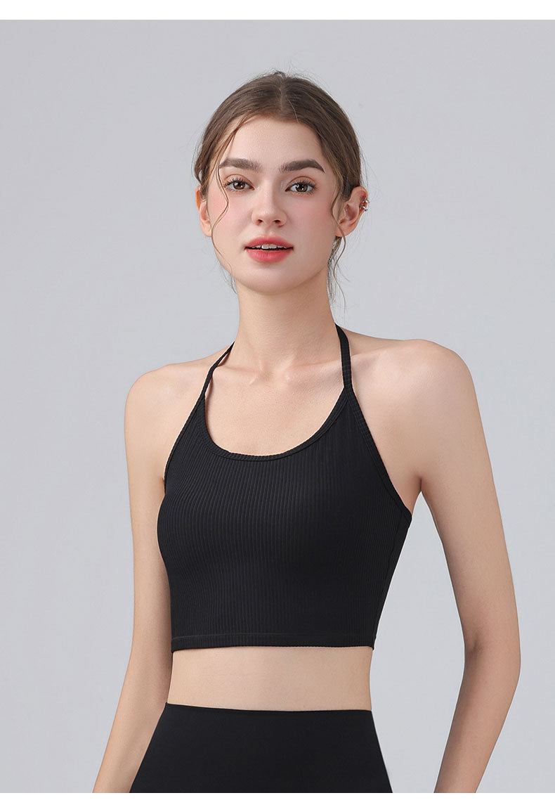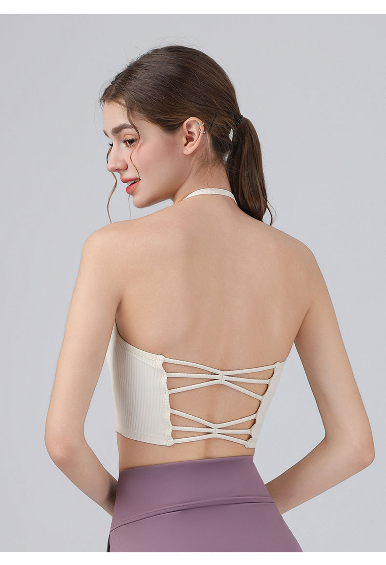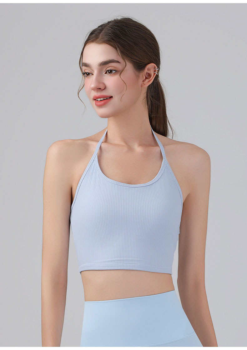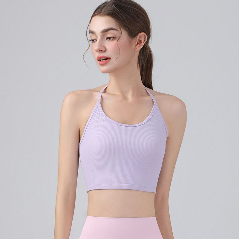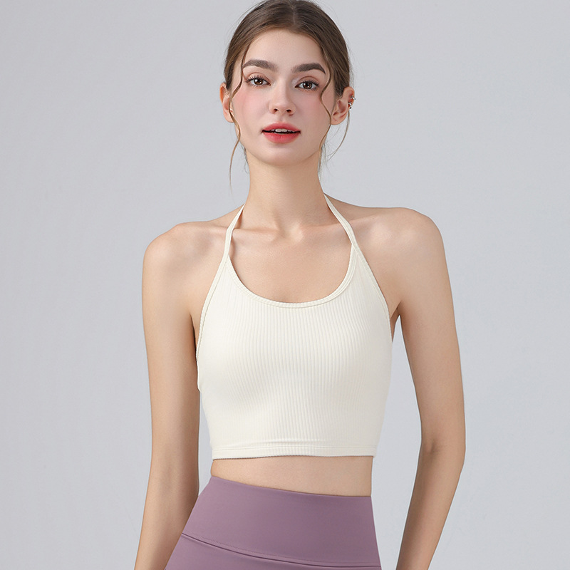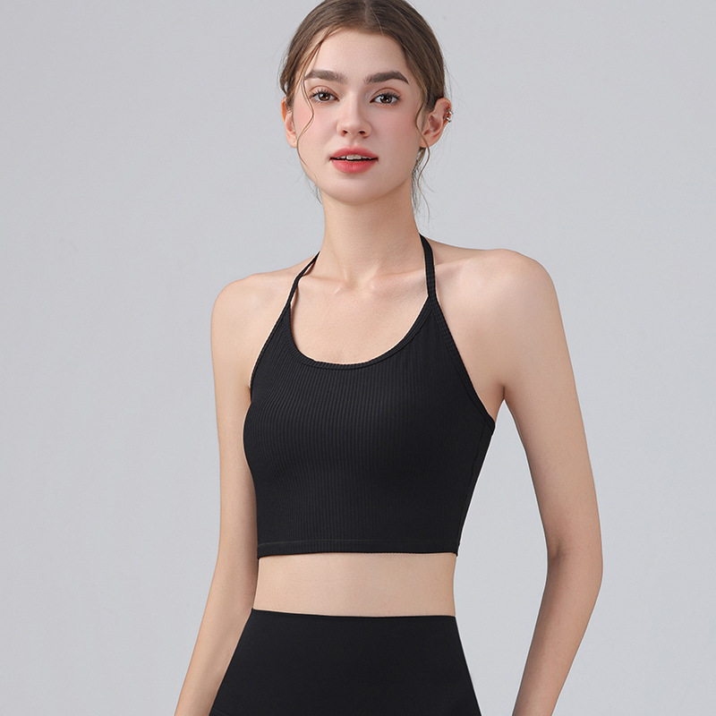 여성을위한 전문 요가 의류 2025 가슴 패드가있는 하이 엔드 패션 홀터넥 스포츠 브라 충격 방지 브라 피트니스 조끼 여름