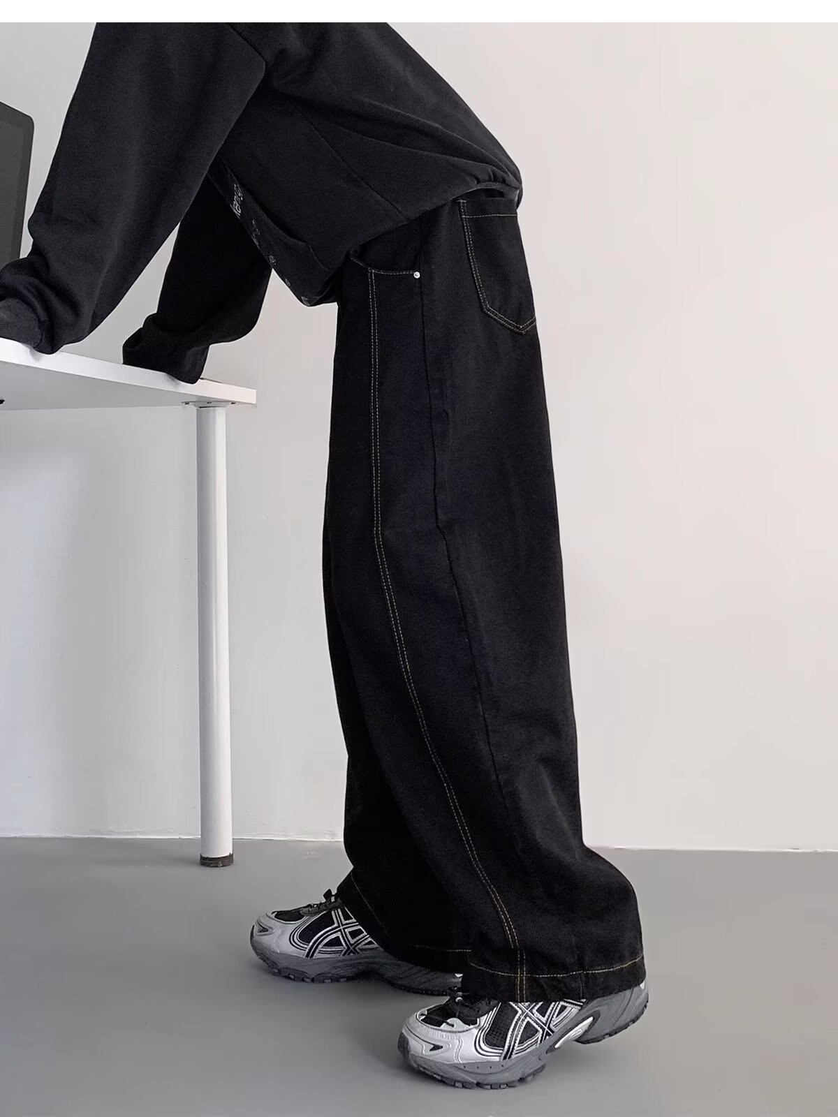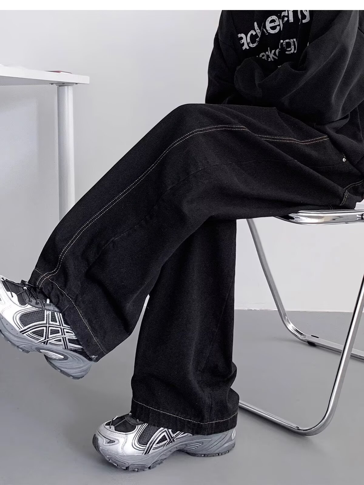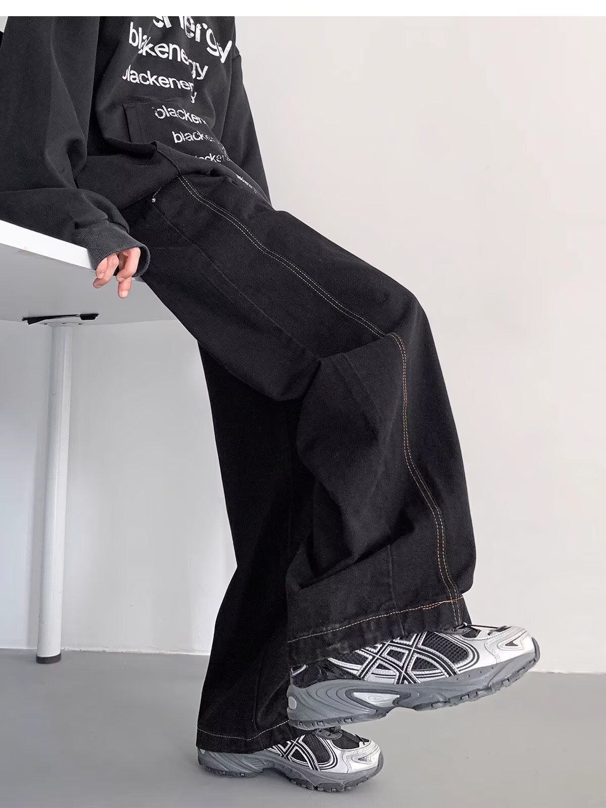매달린 다크 진 남성 여름 미드 하이 웨이스트 와이드 레그 다용도 레트로 오버사이즈 스트레이트 캐주얼 바지