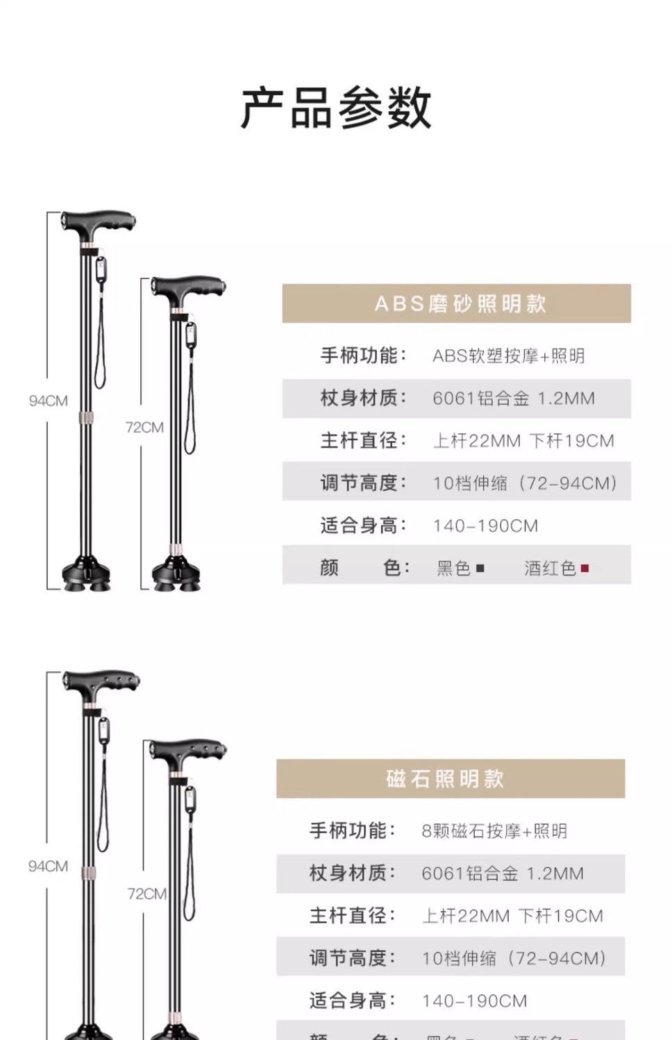 • 야간 조명이 있는 검정색의 안정적인 대형 4족 목발