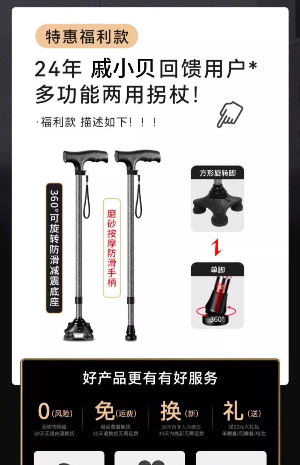 • 보조 기립 팔걸이, 검정색 조명이 있는 안정적인 대형 4족 목발