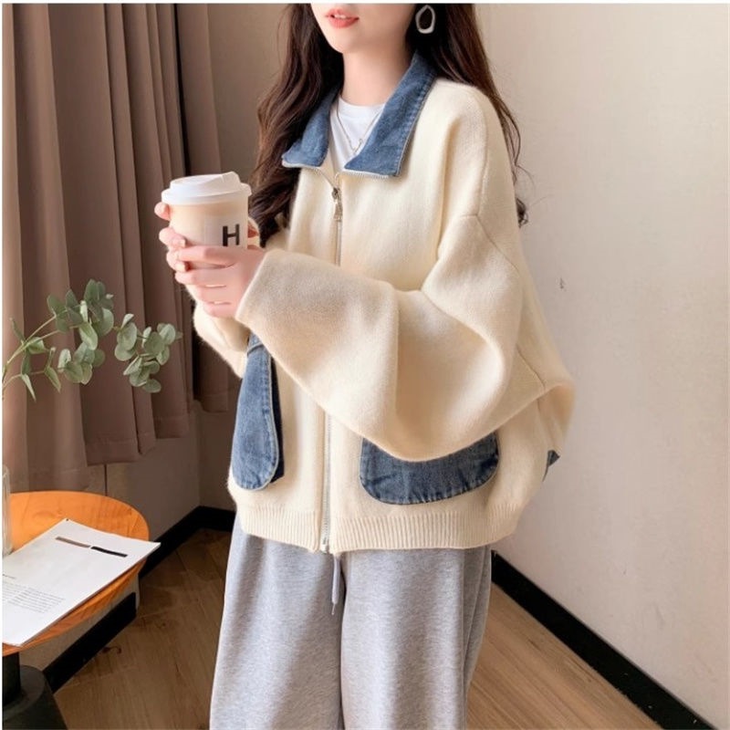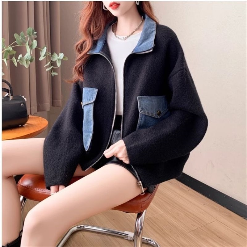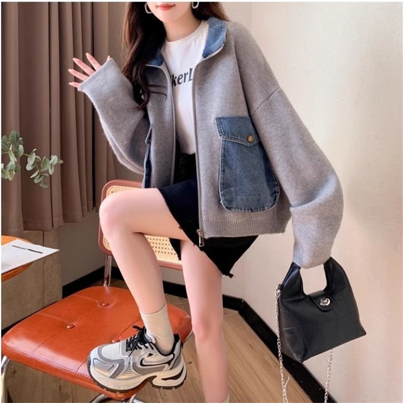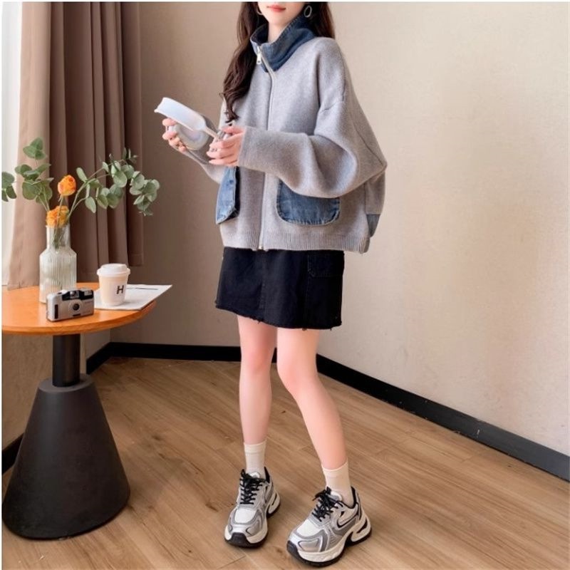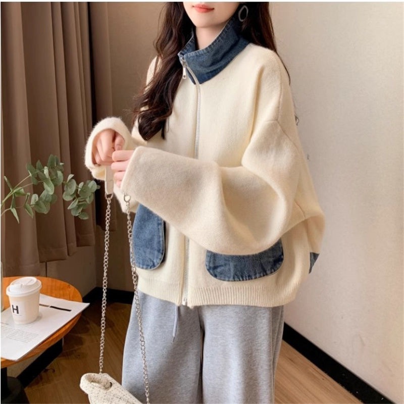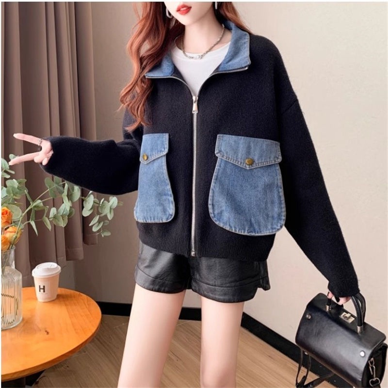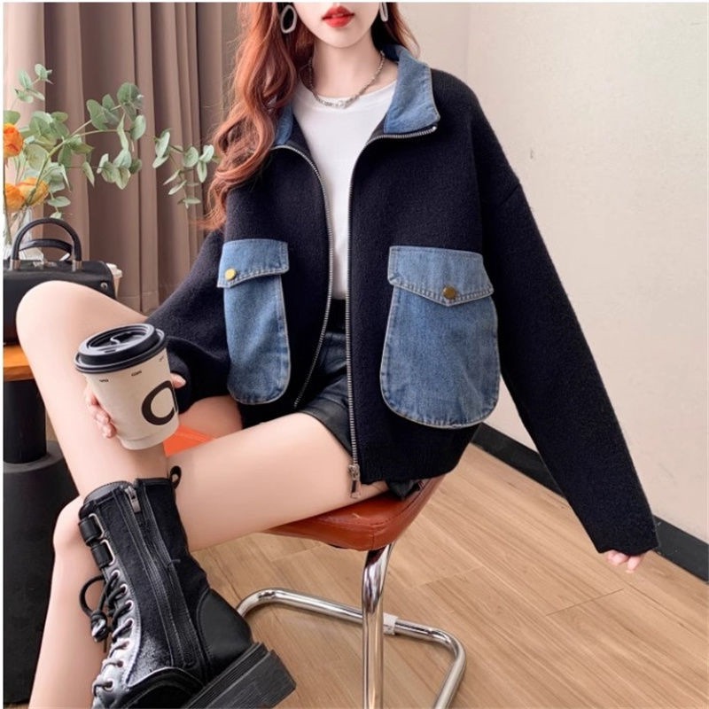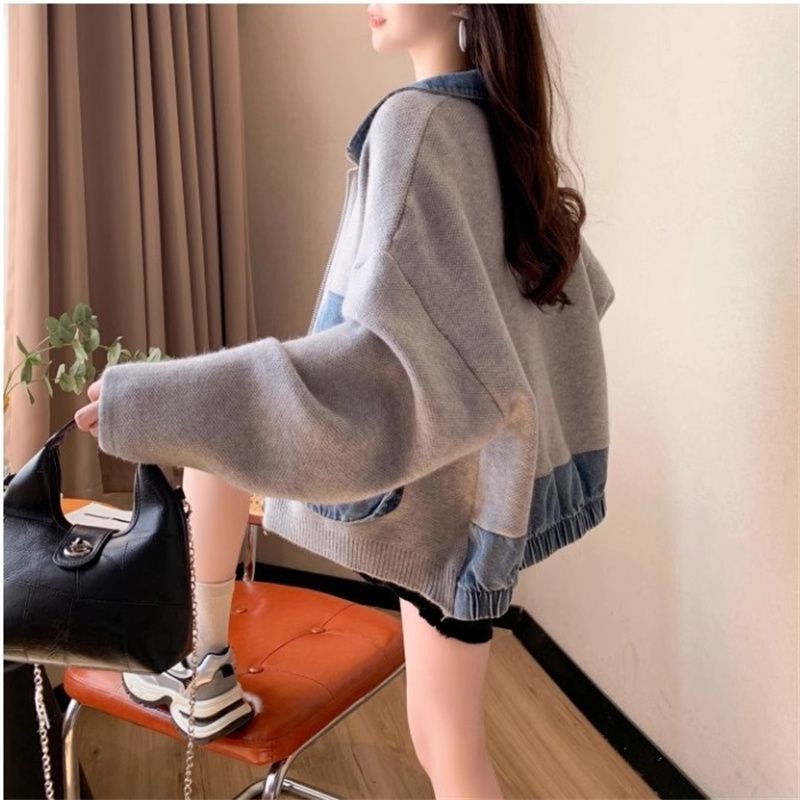 데님 스플라이스 스웨터 재킷 여성 신작 가을 겨울 쁘띠 아우터 쇼트 탑 다용도 니트 가디건 트렌디