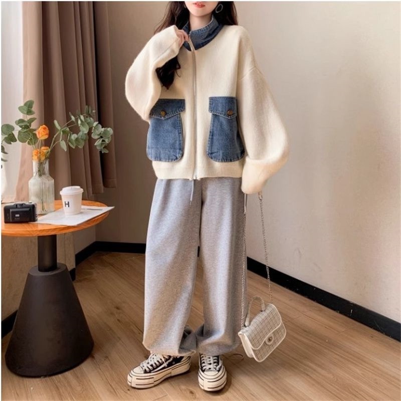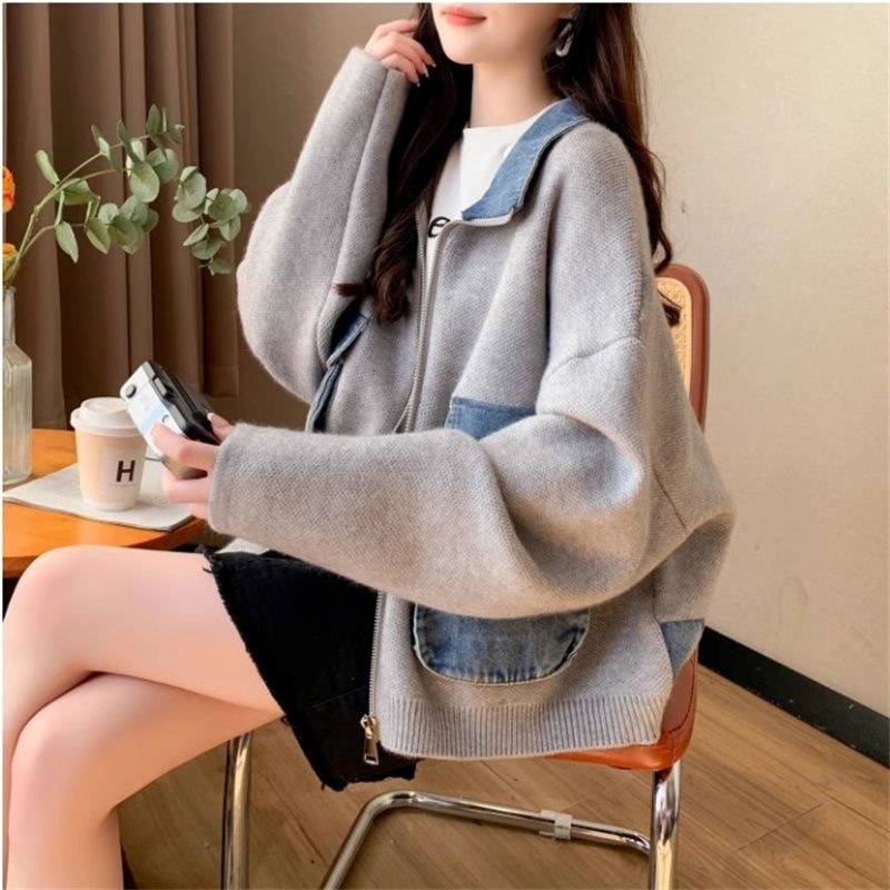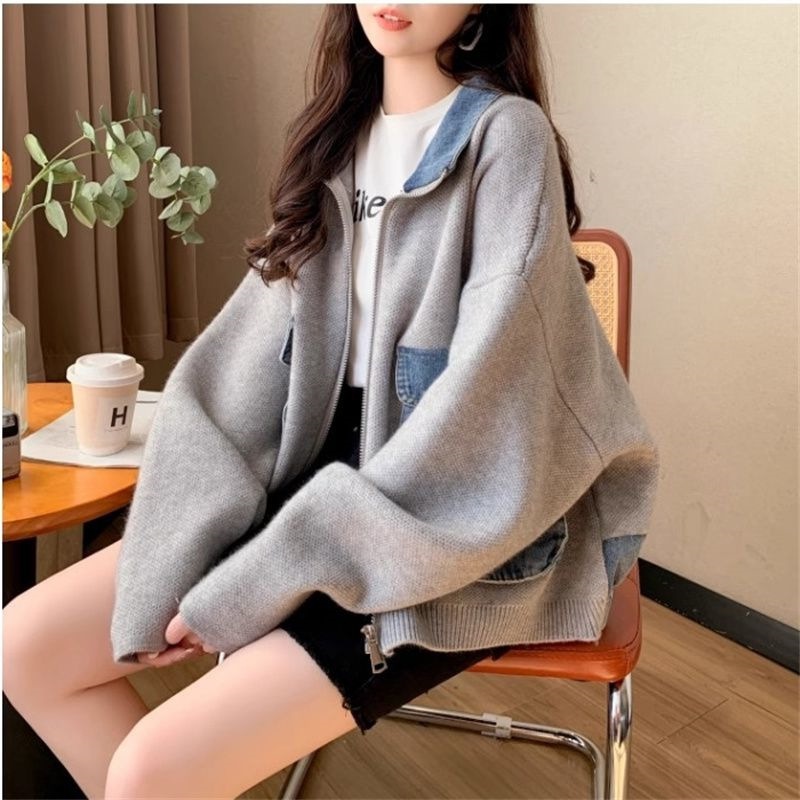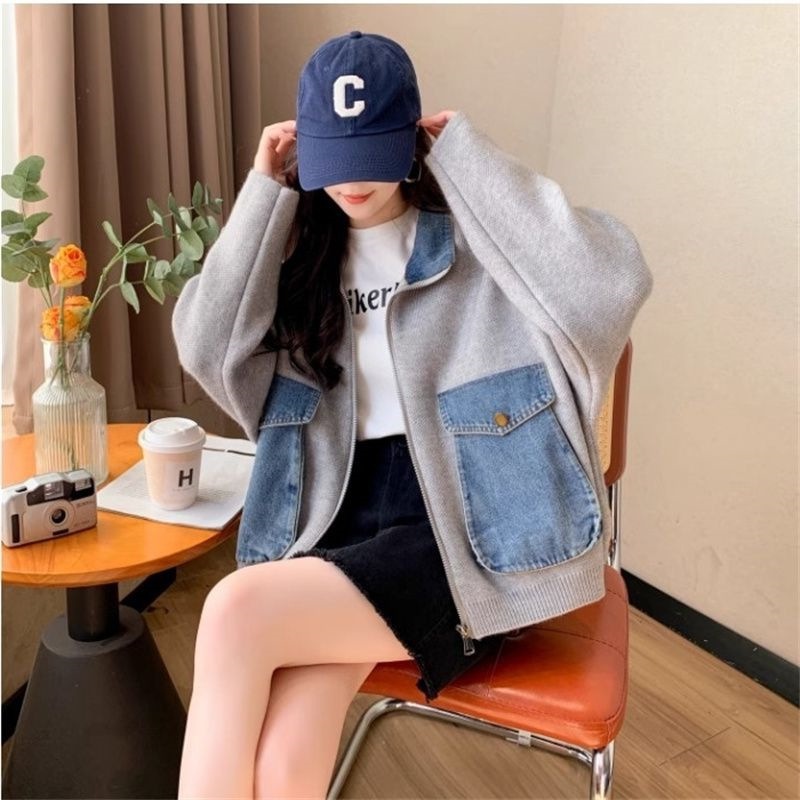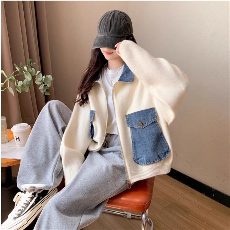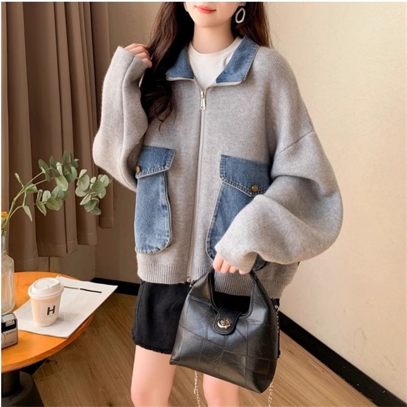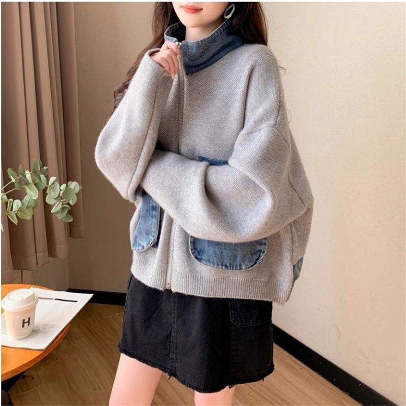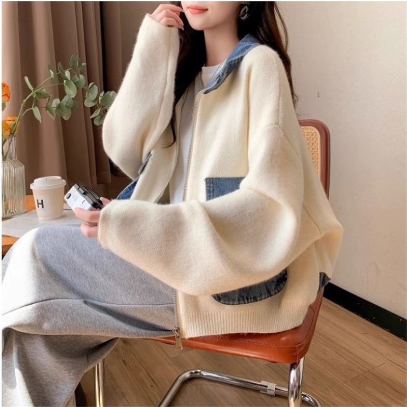 데님 스플라이스 스웨터 재킷 여성 신작 가을 겨울 쁘띠 아우터 쇼트 탑 다용도 니트 가디건 트렌디