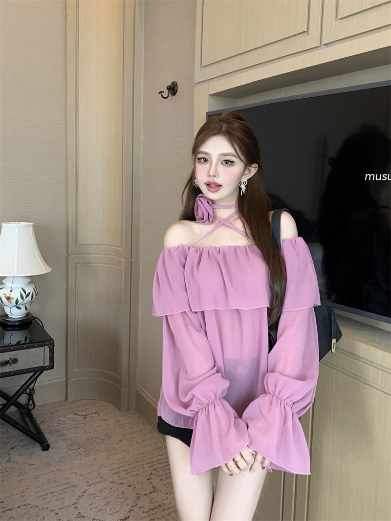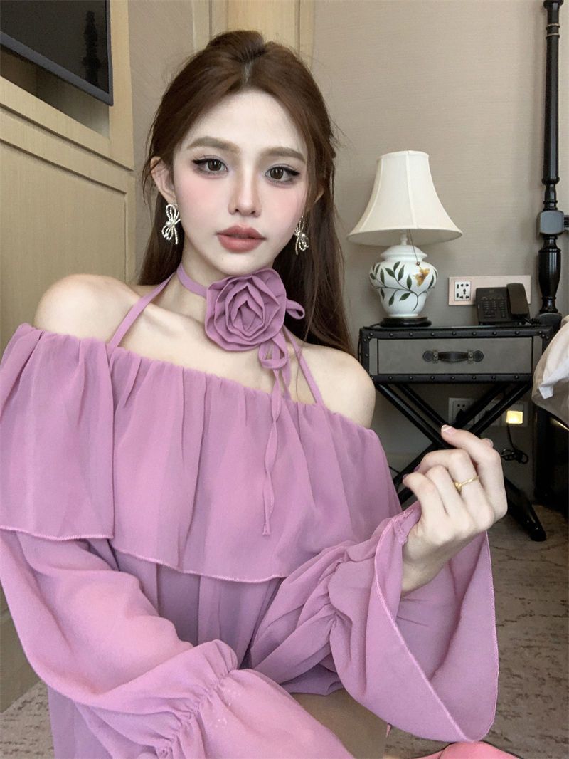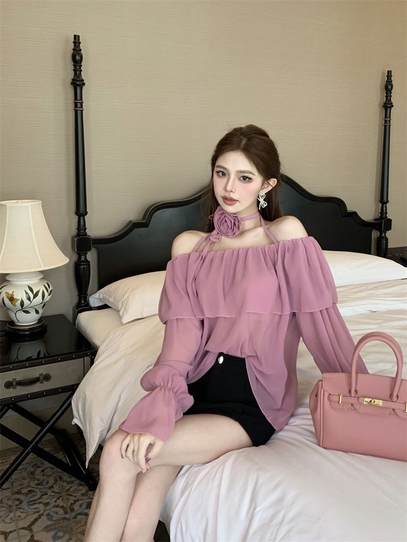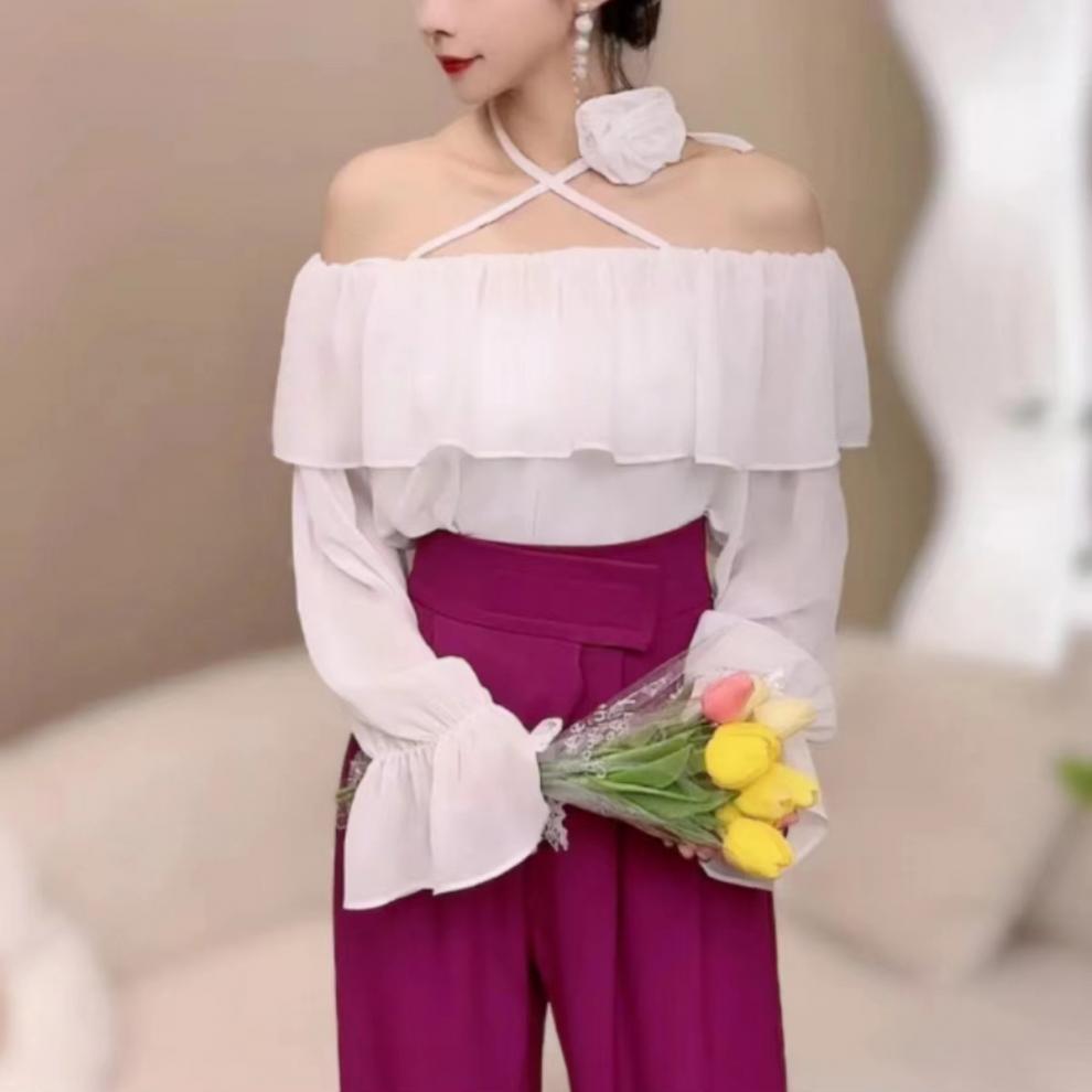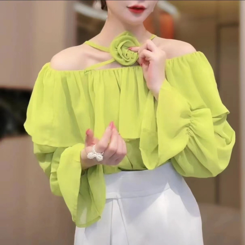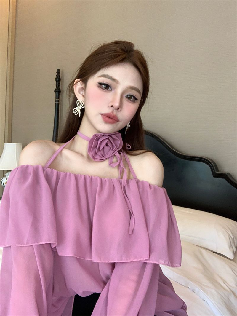 여성을위한 로즈 스트랩 원 숄더 쉬폰 셔츠 봄 달콤한 기질 랜턴 긴팔 셔츠 부드러운 루즈 탑