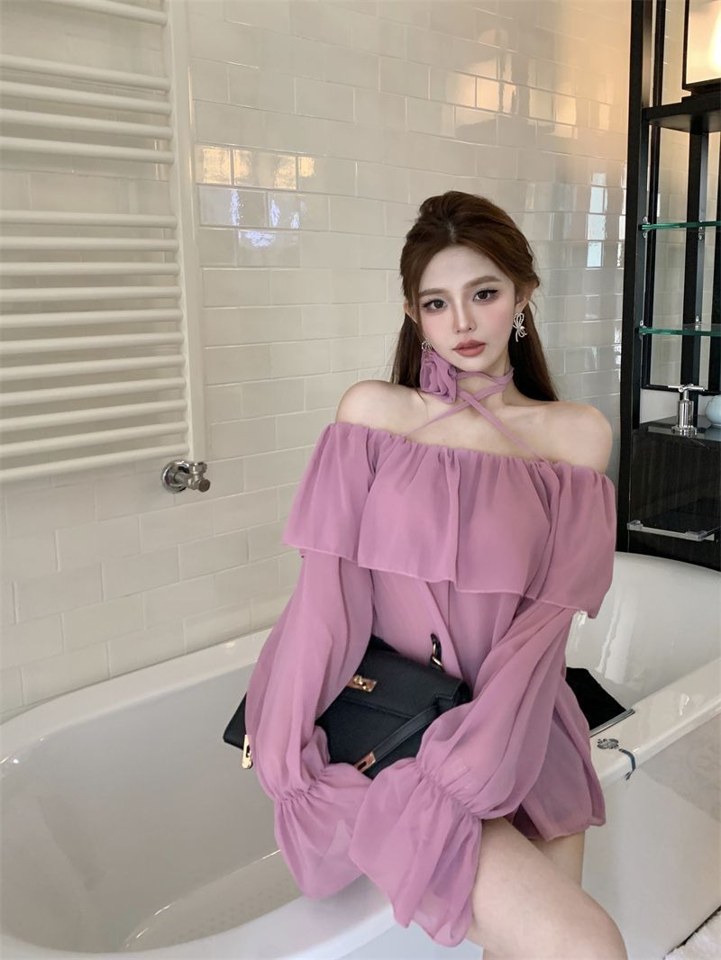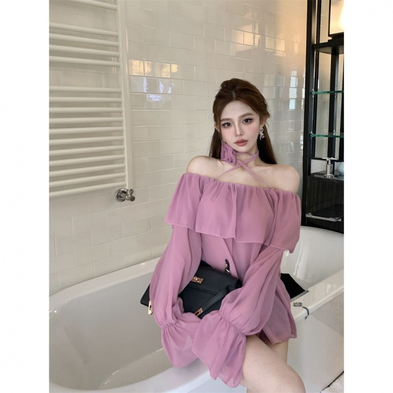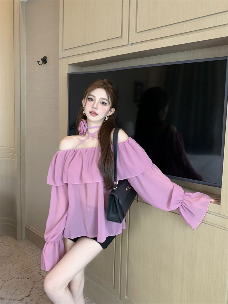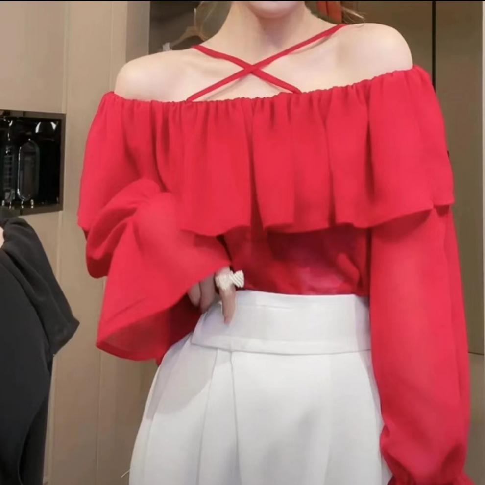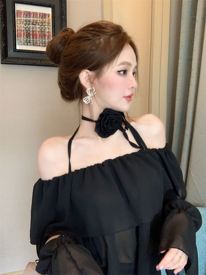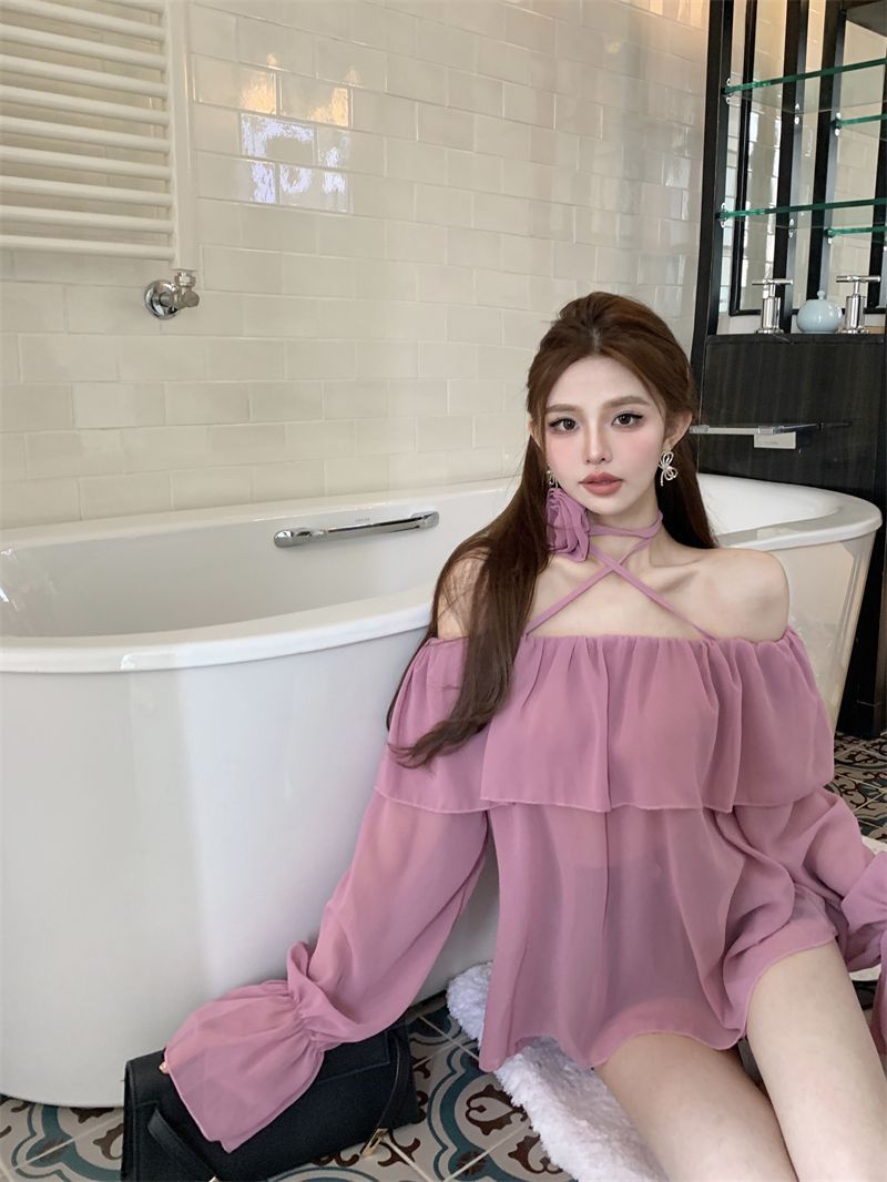 여성을위한 로즈 스트랩 원 숄더 쉬폰 셔츠 봄 달콤한 기질 랜턴 긴팔 셔츠 부드러운 루즈 탑