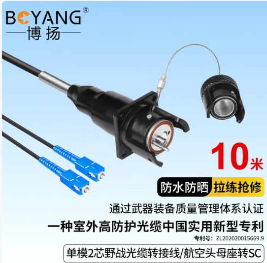 博扬 单模2芯室外TPU野战光缆转接线 车壁式航空接头母转SC头 防水金属航空头-SC10米 BY-2S-YKSC10M*1合格证