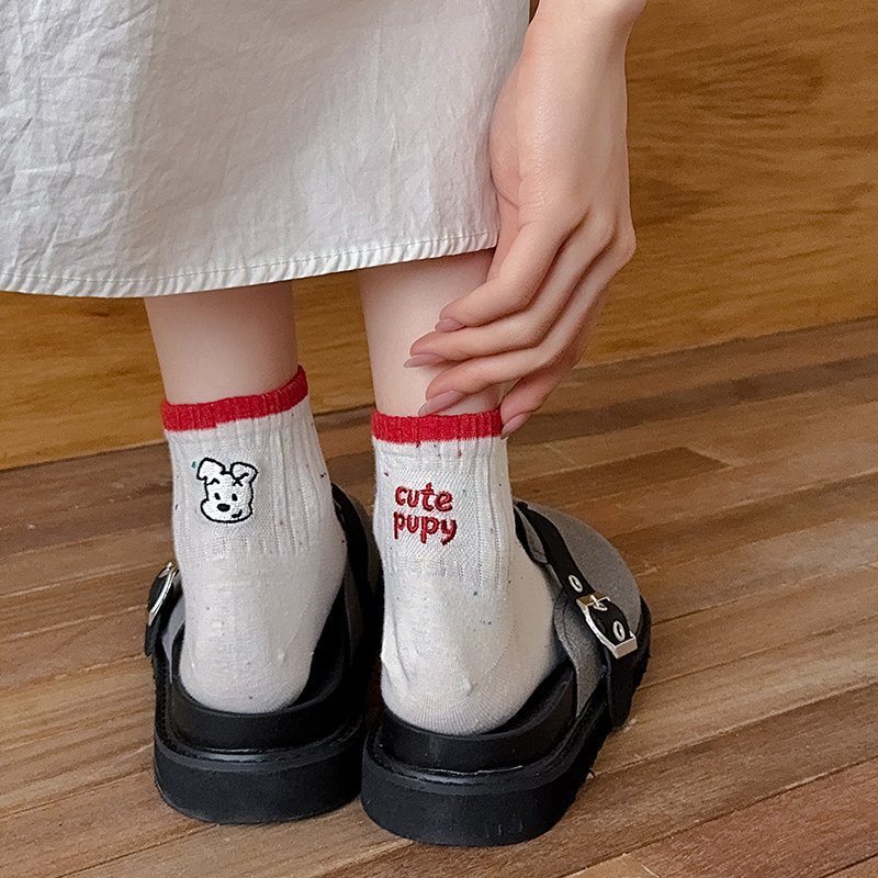 고급스러운 한국 인스 스타일 자수 강아지 2025 봄 여름 신상품 패션 콤비 코튼 AB 스타일 여성용 짧은 양말