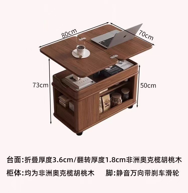전체 원목 접이식 사이드 캐비닛, 리프팅 가능한 소파 사이드 테이블, 거실 커피 테이블, 소형 아파트 이동식 다기능 트롤리