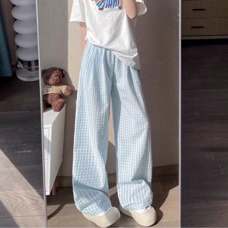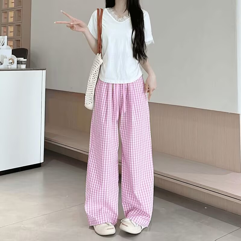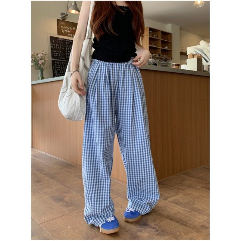 여성을위한 귀여운 도파민 드레이프 좁은 캐주얼 격자 무늬 바지 2025 봄, 여름 얇은 게으른 느슨한 다목적 와이드 레그 팬츠스토어 가기