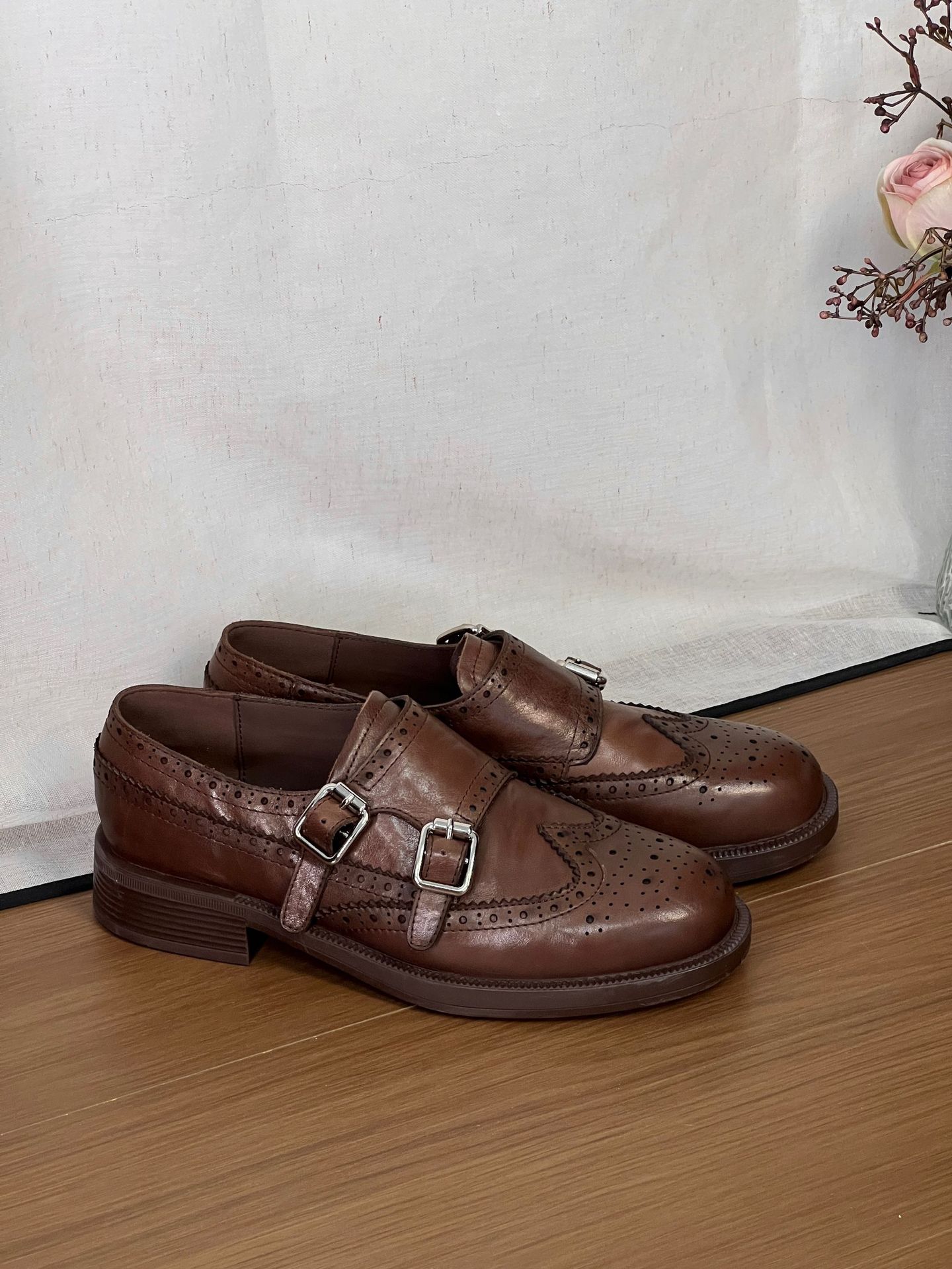 Bamuxiu 2025 가을, 겨울 복고풍 전체 가죽 브로그 조각 작은 가죽 신발 여성 로퍼 벨트스토어 가기