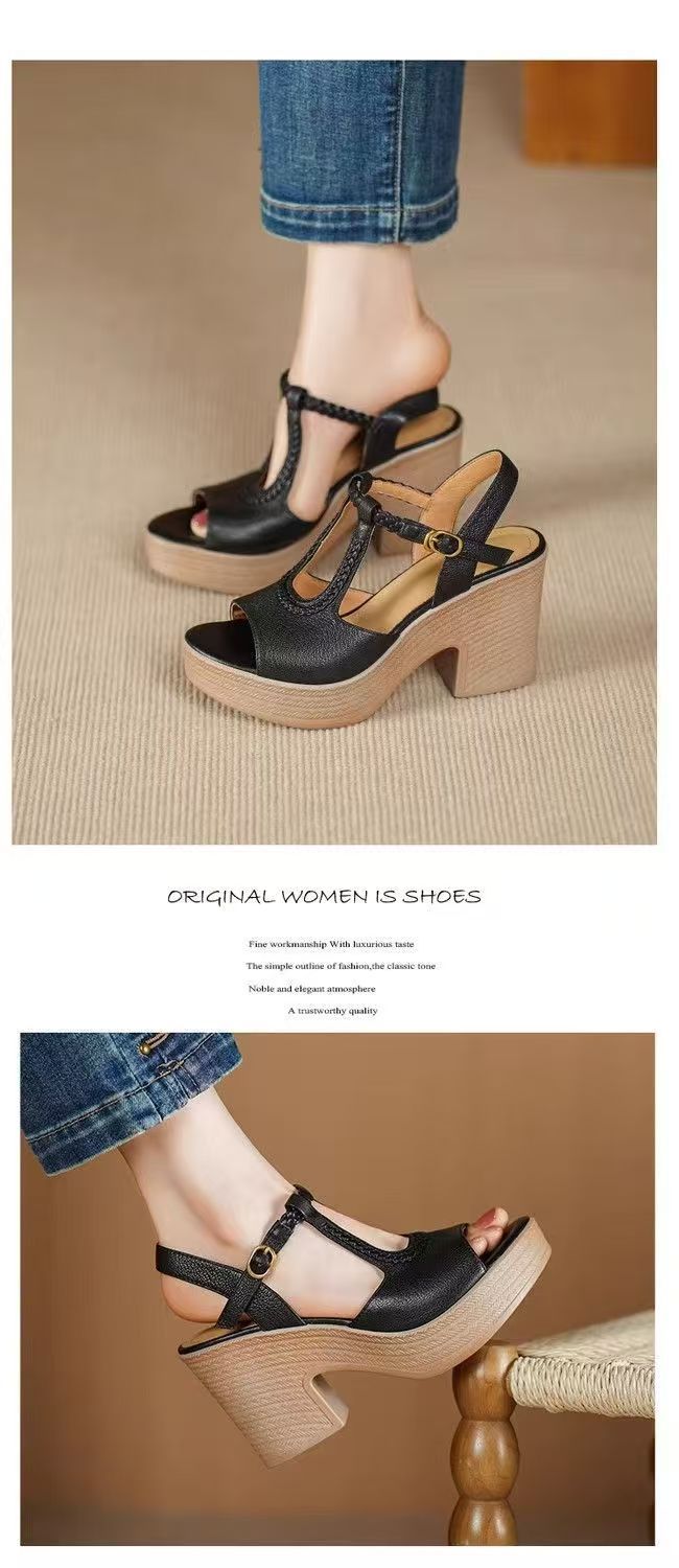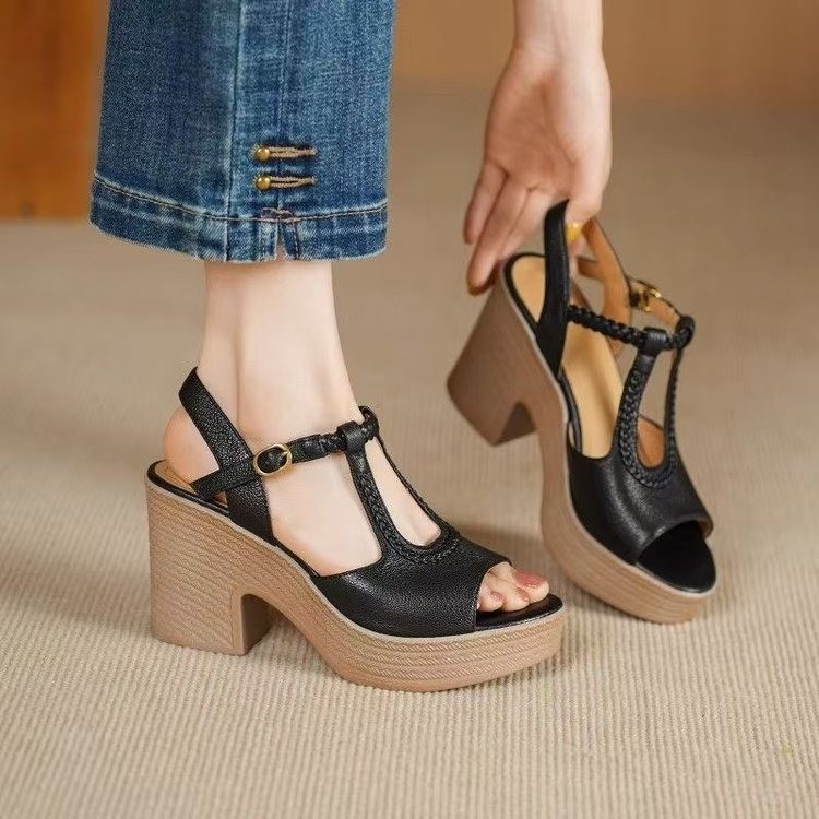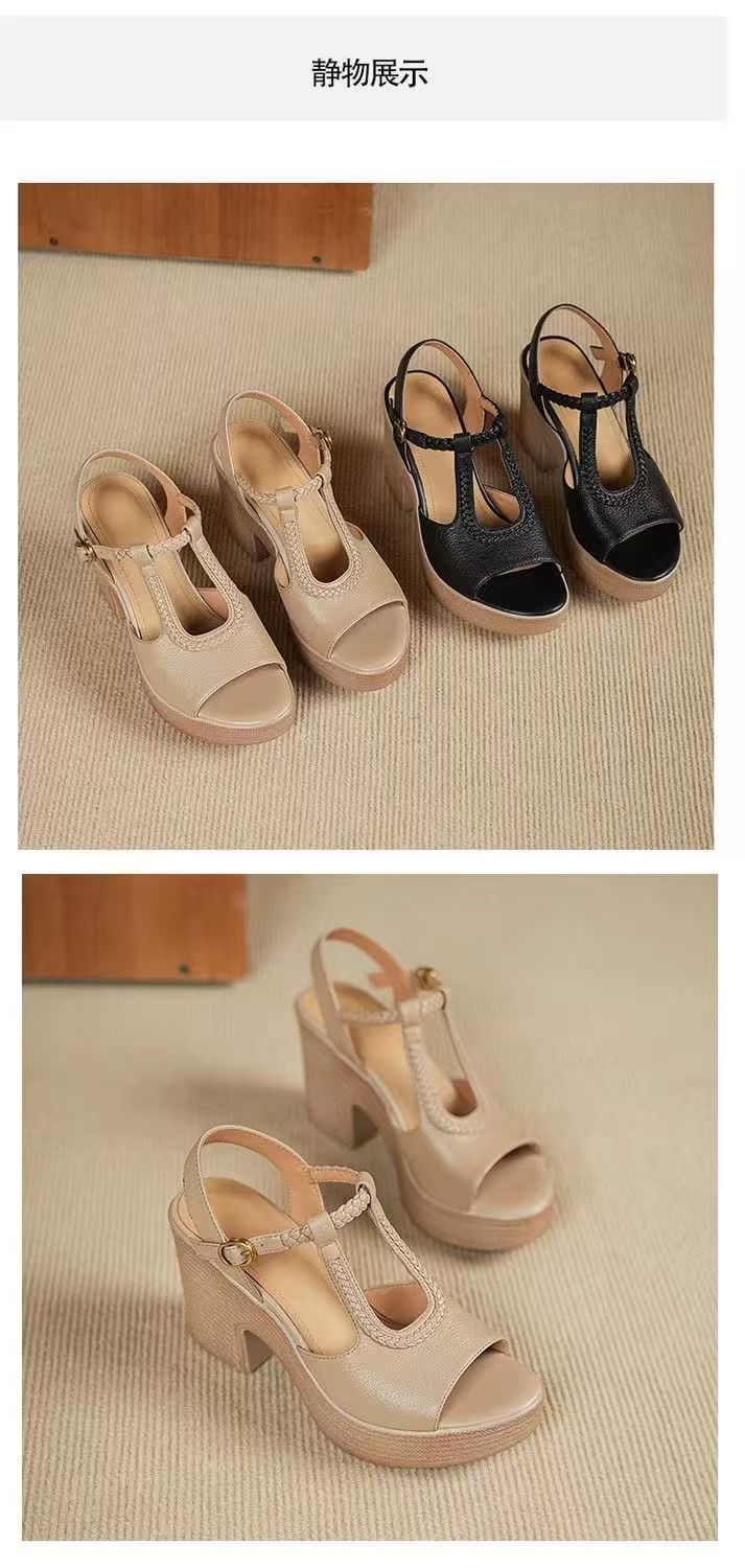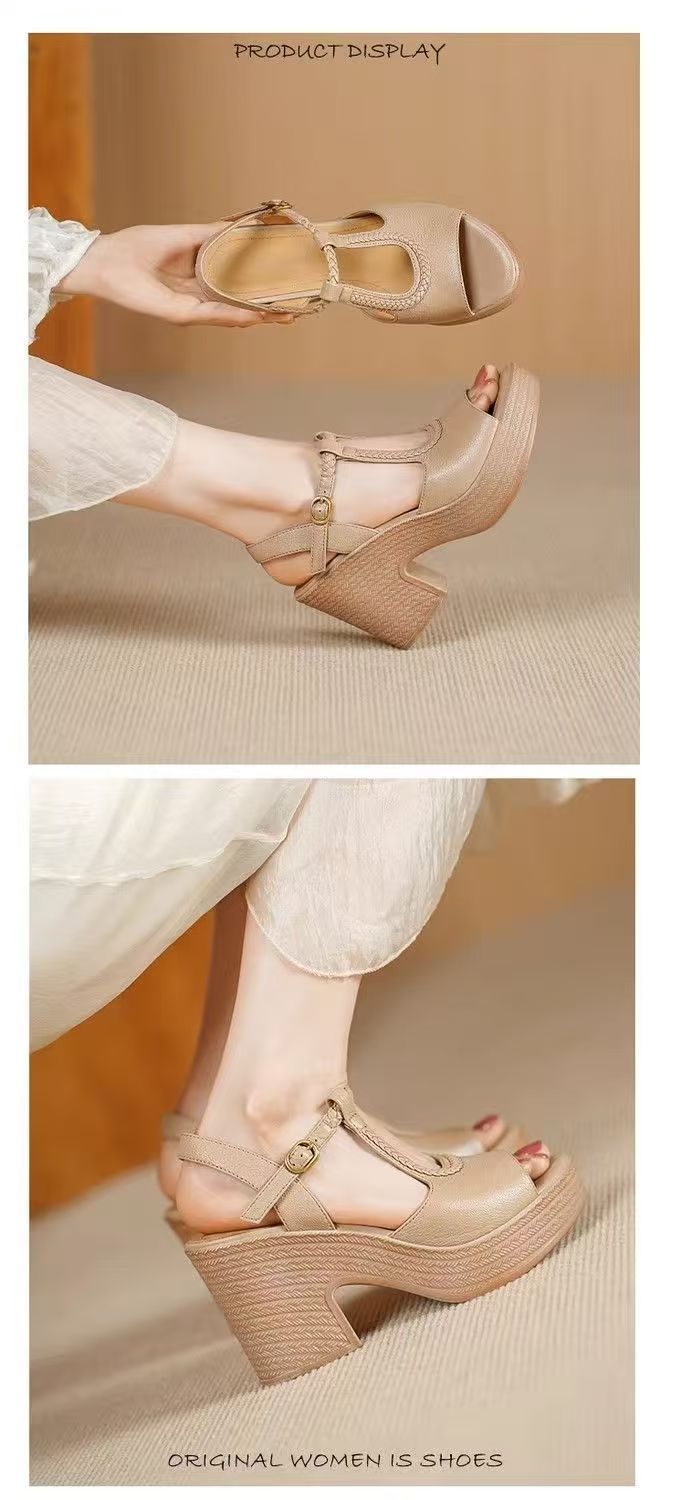 여성을위한 새로운 스타일의 작은 두꺼운 하이힐 샌들 2025 여름 두꺼운 밑창 양피 물고기 입 로마 샌들 여성을위한 여름 스커트스토어 가기