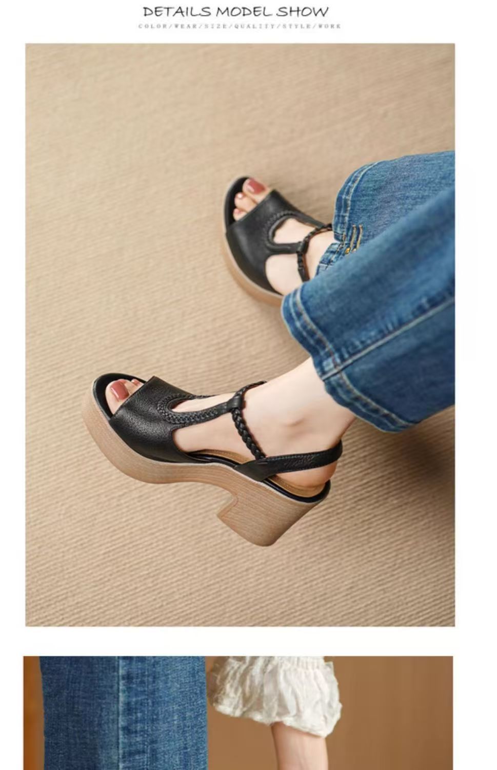 여성을위한 새로운 스타일의 작은 두꺼운 하이힐 샌들 2025 여름 두꺼운 밑창 양피 물고기 입 로마 샌들 여성을위한 여름 스커트